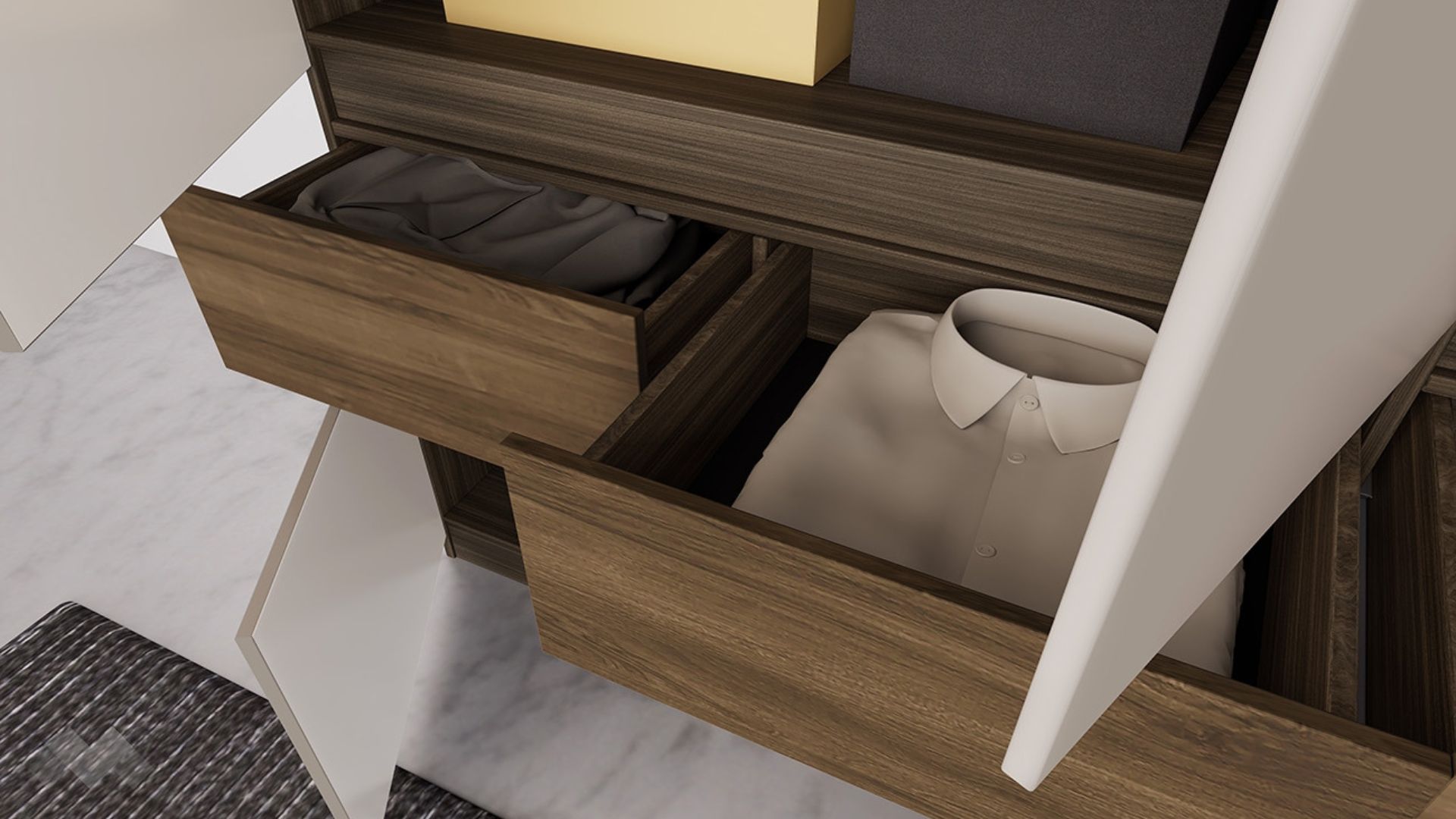 Гардероб Поситано е изработен от 18 мм МДФ и 16 мм ПДЧ и всички врати и чекмеджета са с механизъм за плавно затваряне. Чекмеджетата са снабдени с телескопични сачмени водачи и се изтеглят до край за лесен достъп до съдържанието, като същевременно гарантират дълготрайна устойчивост.