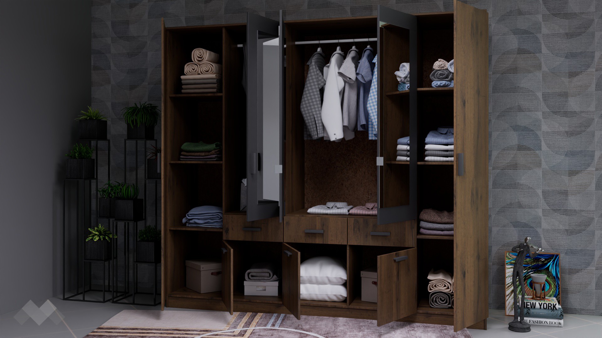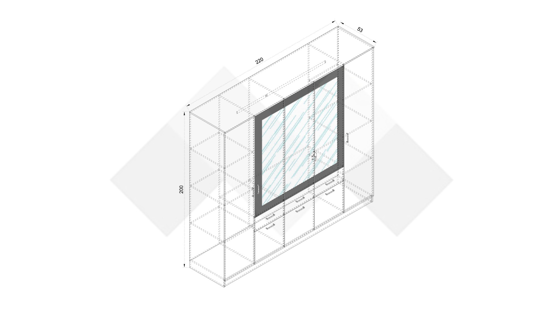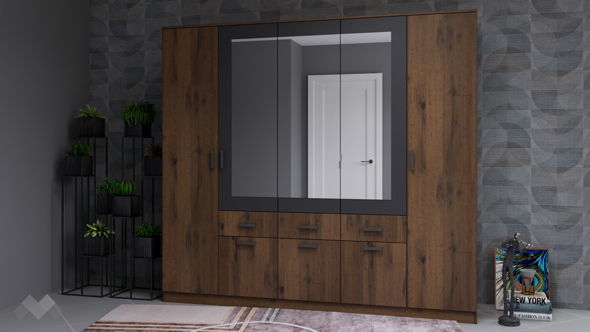 Този модел е просторен и функционално разпределен – разполага с общо 6 рафта за сгънати дрехи и 2 лоста за закачалки. Иновативното в модела е, че той съчетава размерите и обема на гардероб с функционалността на скрин. Освен всичко останало, разполагаш и с 3 чекмеджета и 3 шкафа с вратички под тях, в които можеш спокойно да организираш всички свои вещи. На три от вратите са разположени огледала, които ще ти помогнат при избора на тоалет и ще направят стаята да изглежда визуално по-голяма. Можеш да си сигурен в едно – това определено е моделът, в който ще намериш място за всичките си дрехи и аксесоари.