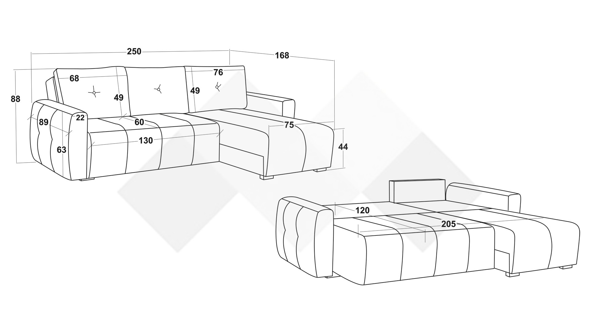 Д: 250 см Ш: 168 см В: 88 см