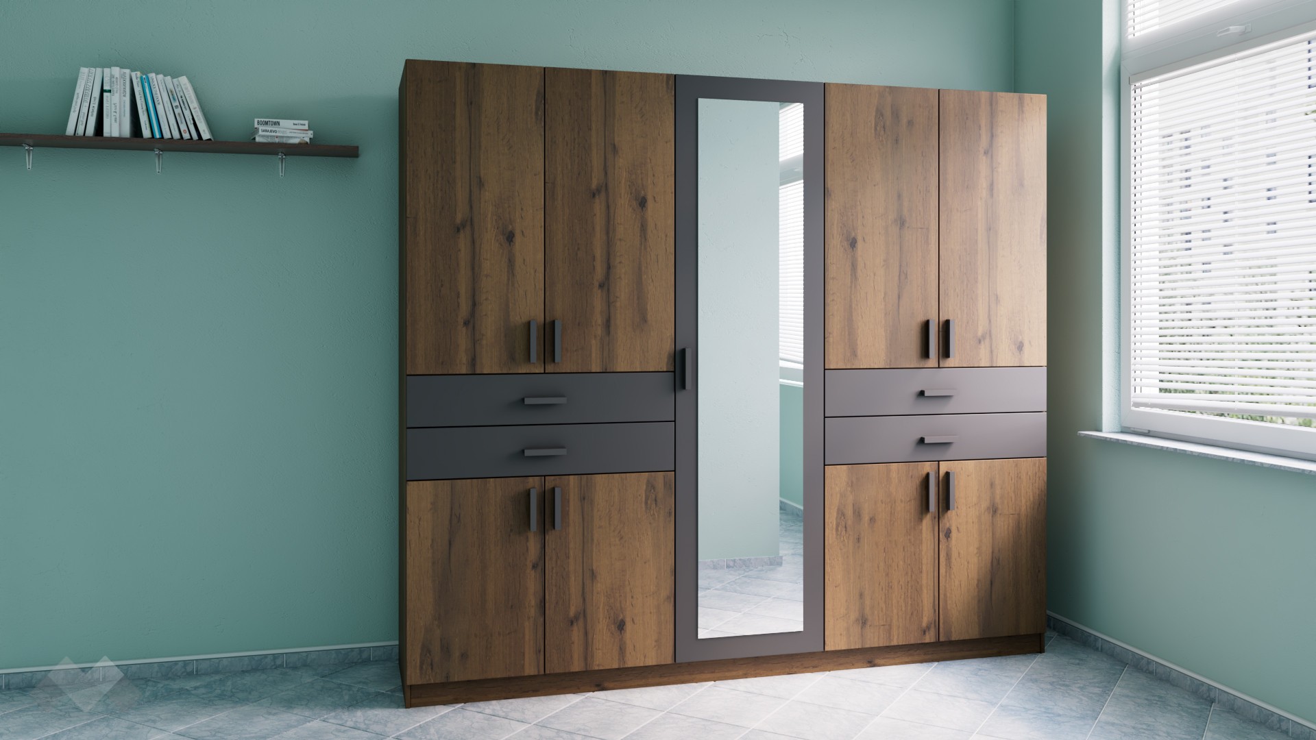 Ако държиш на стилните и практични мебели, гардероб Рос ще те впечатли. Декорът е неутрален, с усещане за естествени дървесни нишки в модерен стил. Практичен гардероб, който съчетава в себе си обема и разпределението на голям гардероб, а в същото време сме добавили за още по-голямо удобство чекмеджета и рафтове, присъщи на скриновете.