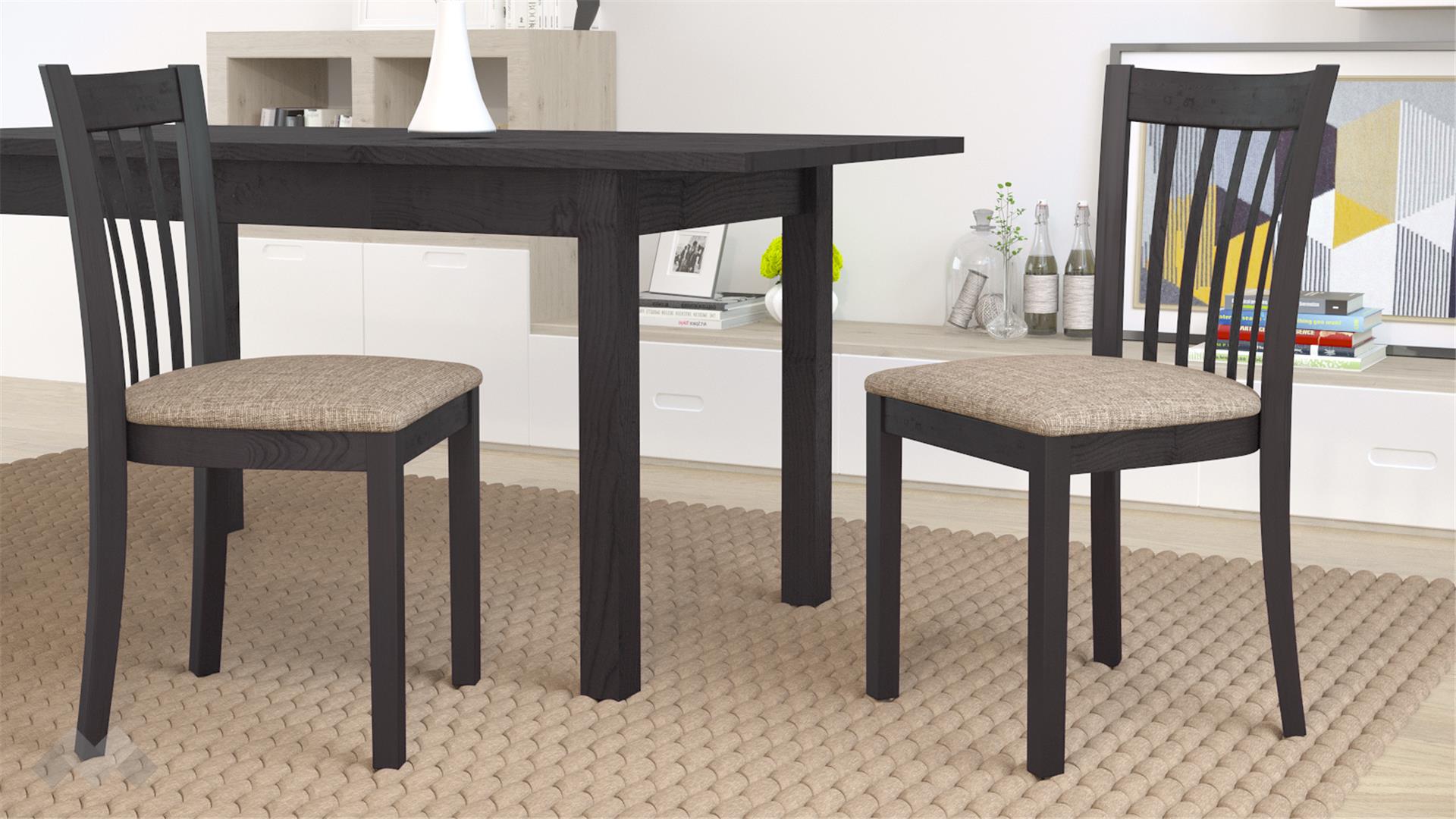 Столът е със здрава конструкция от естествена букова дървесина за устойчивост и стабилност, а лаковото покритие добавя елегантност. Седалката е проектирана с твърда основа, тапицирана с дунапрен за повече комфорт при седене и завършен със здрава текстилна дамаска, лесна за поддръжка.