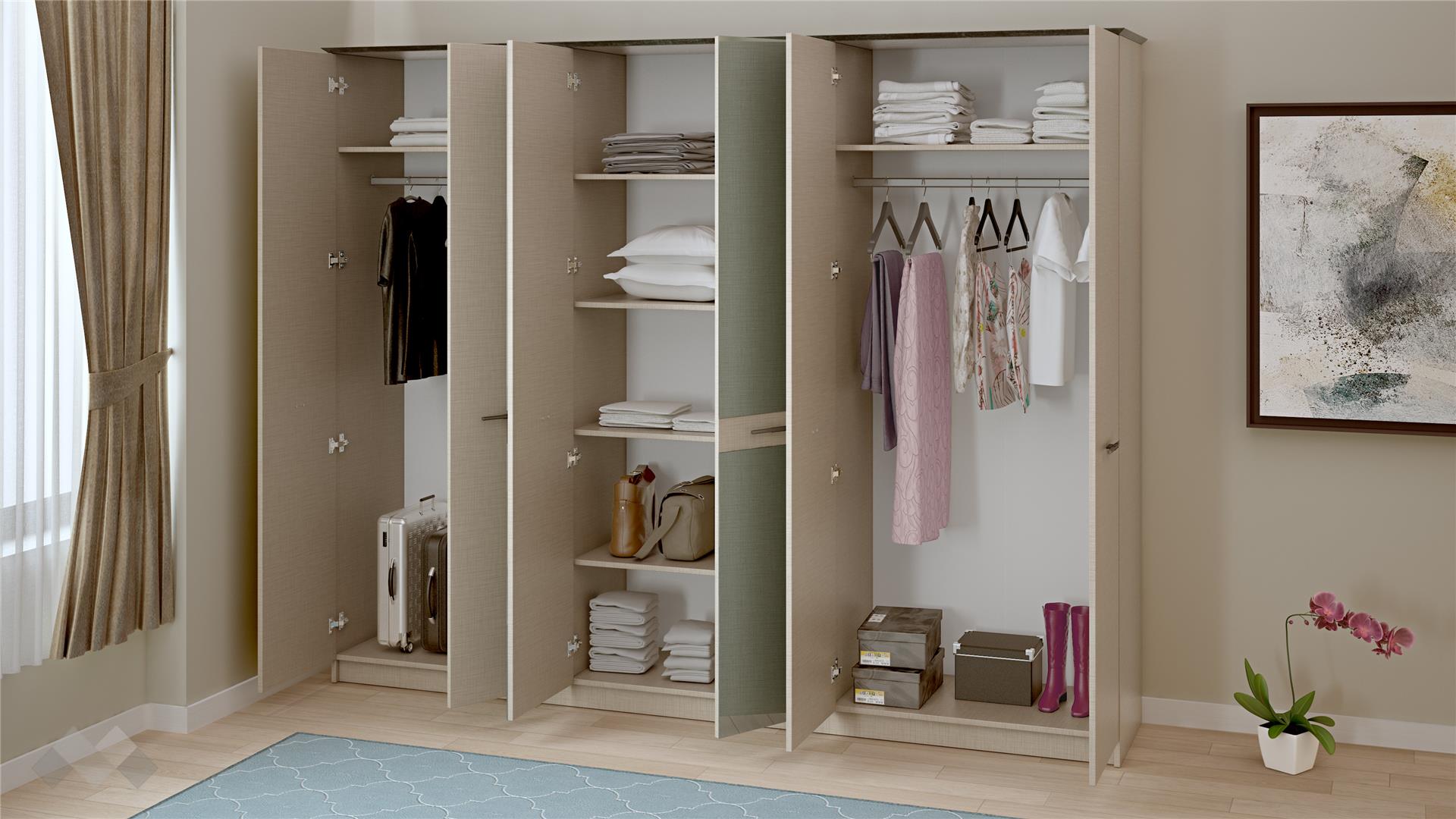 ✓ 18 мм ПДЧ ✓ шесткрилен ✓ 2 лоста за закачалки ✓ плавно затваряне на вратите ✓ 6 рафта ✓ модерен декор ✓ качествена изработка