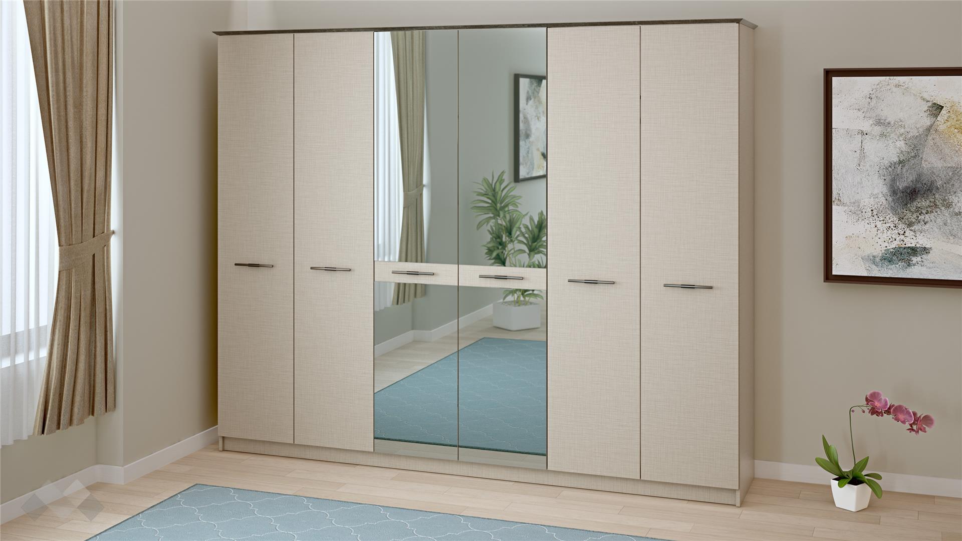 Гардеробът е просторен и функционален - с два лоста за закачалки и шест рафта, за да организираш всичките си дрехи. Двете огледални врати, освен, че служат за финален оглед на визията си, те визуално увеличават пространството и отразяват светлината в помещението. Елегантните дръжки подчертават модерния и изискан стил.