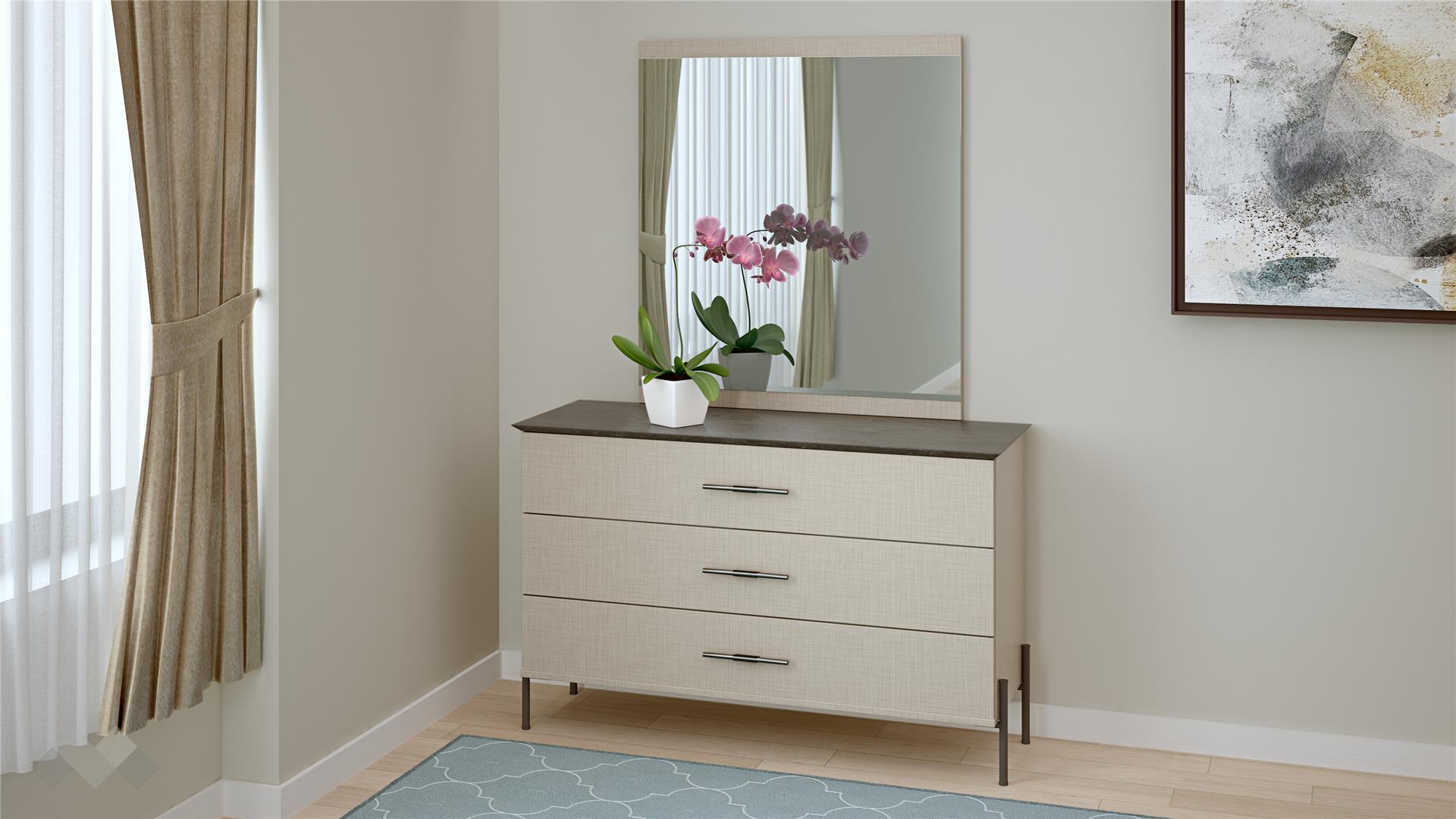 Скринът ти предоставя три просторни чекмеджета, в които да съхраниш както бельо и дрехи, така и малки уреди или козметика. Плотът е достатъчно просторен, за да подредиш върху него декорация или козметиката си и в комбинация с огледалото да го превърнеш в своето кътче за разкрасяване.