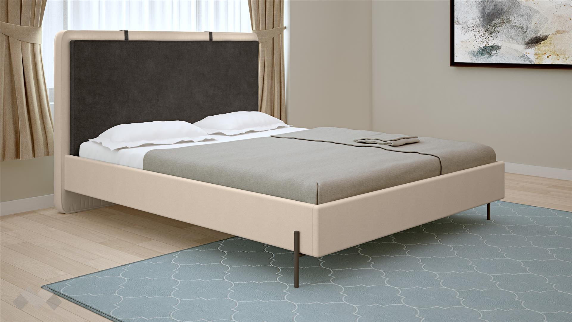 Спалнята е подходяща за матрак с размер 160/200. Тапицираната и мека табла е идеална за разпускане преди сън. Високите крака са предимство при почистването под нея.