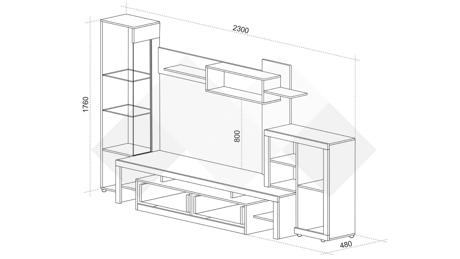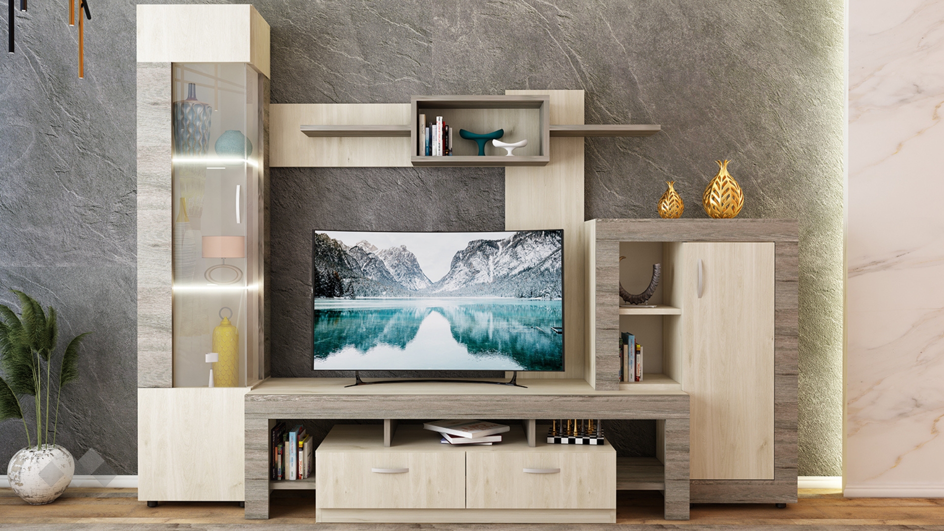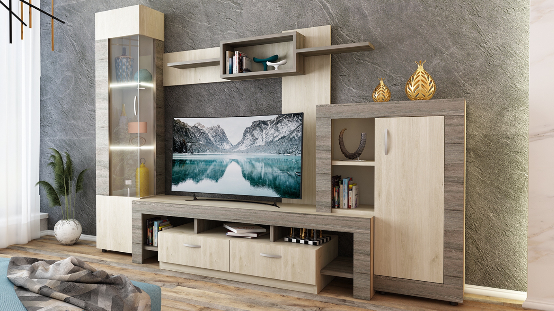 Секцията разполага с витринен шкаф, където да подредиш красиви сервизи, стилни украси и декорации, които няма да убягнат от погледите на гостите ти, но и ще бъдат съхранени на сигурно място. ТВ шкафът предлага достатъчно пространство, където да поставиш всичките си дискове и съпътстваща техника като ТВ приемници, DVD плейъри или друга техника. Можеш да ги организираш в две чекмеджета и още пет отворени пространства разположени над и до чекмеджетата. Към рафтовете на витрината е монтирано ефектно LED осветление, което дискретно ще освети пространството около секцията и ще придаде допълнителен ефект към предметите поставени там. В шкафа от другата страна ще откриеш допълнително място за съхранение на по-обемни вещи, малки ел. уреди или други необходими за теб неща, които ще останат скрити от погледите, но и ще са винаги под ръка. Двете отворени ниши до него ти предоставят пространство за книги, сувенири или любими фотографии. Етажерката в горната част на секцията е прекрасен начин да аранжираш помещението с любими предмети, красиви украси или растения, които ще освежат интериора и ще му придадат по цветен и приятен вид.