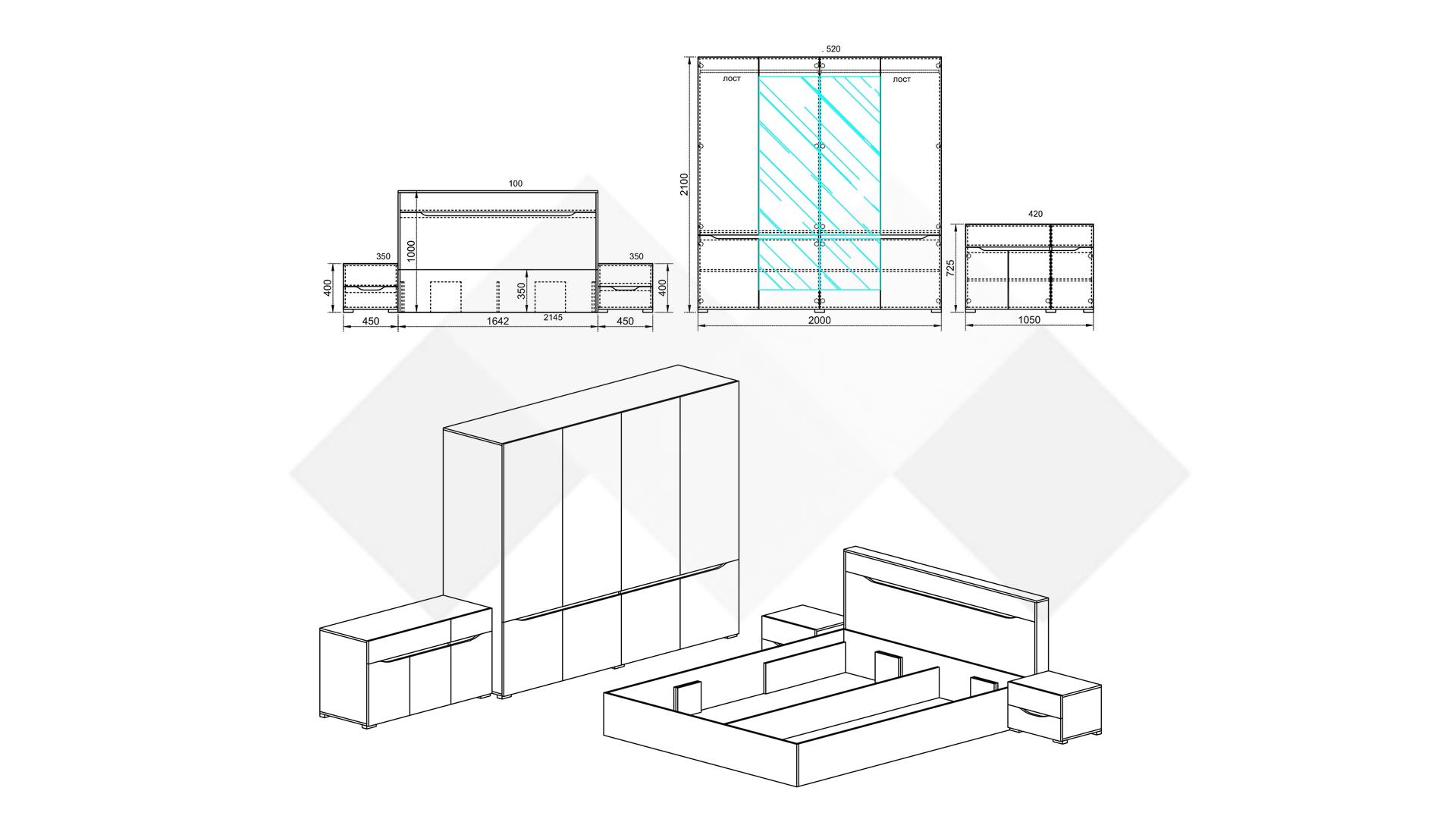 Гардеробът е четирикрил с оптимални размери. Пространството е разпределено между четири рафта и два лоста за закачалки и ти позволява да обхванеш с поглед всичко, за да подбереш бързо тоалетите си. Вратите са с панти с плавно затваряне, а над лостовете за дрехи е вградено практично LED осветление. По цялата височина на две от вратите са монтирани практични огледала.