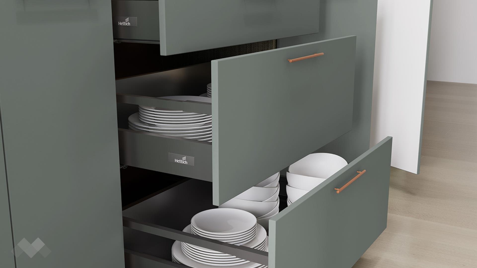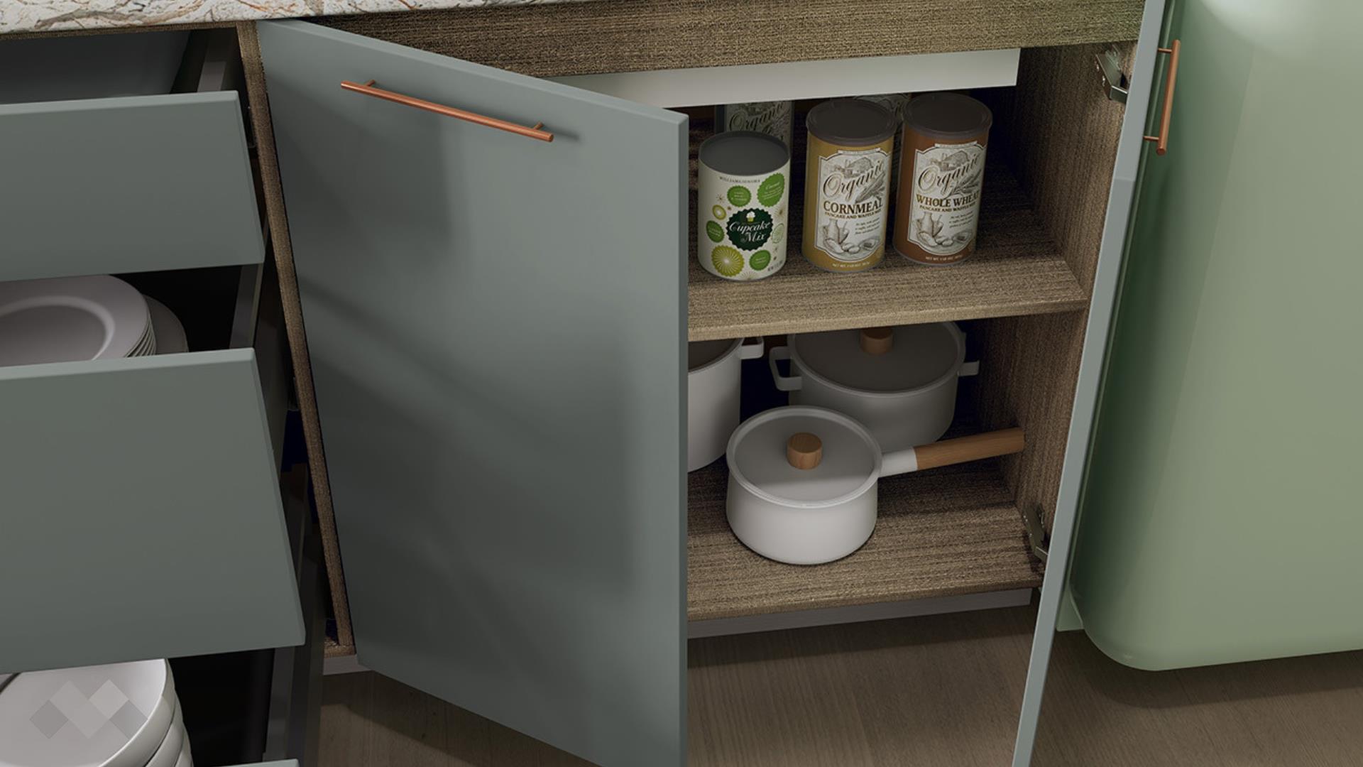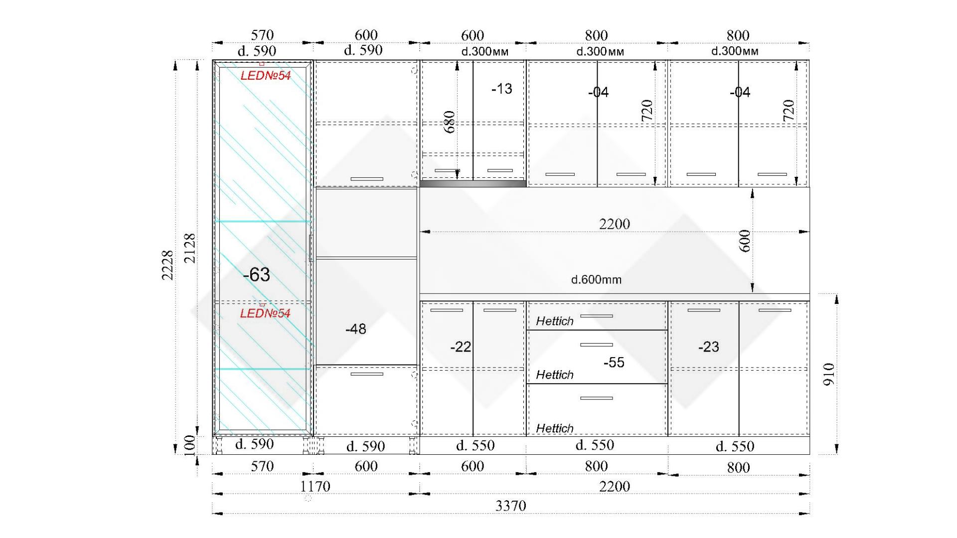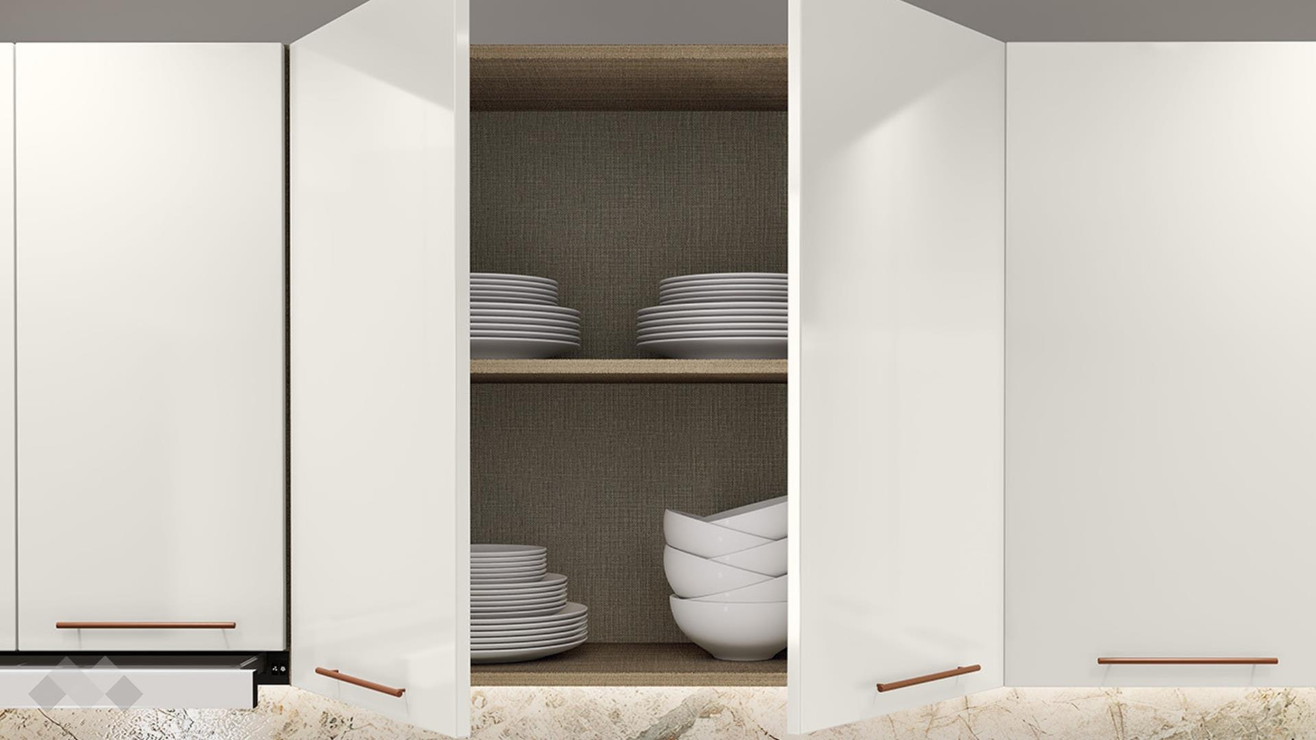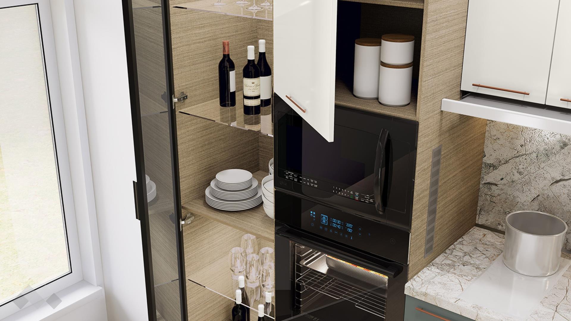Горния ред шкафове са удобни и функционални, за най-често използваните уреди и посуда. Шкаф за вграждане на фурна и микровълнова. Витринния шкаф е с опушени матови стъкла 4 мм., 4 рафта и LED осветление, за да изглежда още по-елегантно. Долния ред шкафове е функционално подбран - перфектната комбинация на шкафове с рафтове и чекмеджета, за да поберат често използваните уреди, подправки и посуда.