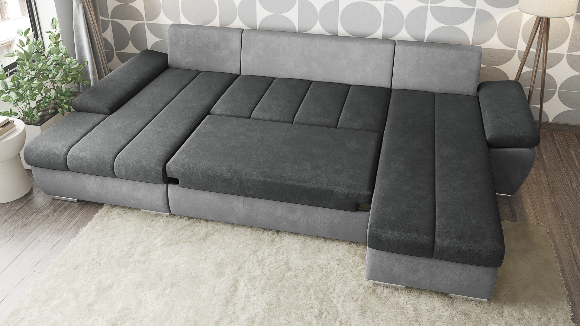 Конструкцията е изградена от твърда основа и 10 см пенополиуретан, които осигуряват стабилна поддръжка, устойчивост и дълготраен комфорт. Моделът впечатлява и с качествена тапицерия в стилна комбинация от графитено черно и светлосиво, допринасяща за изисканата му визия.