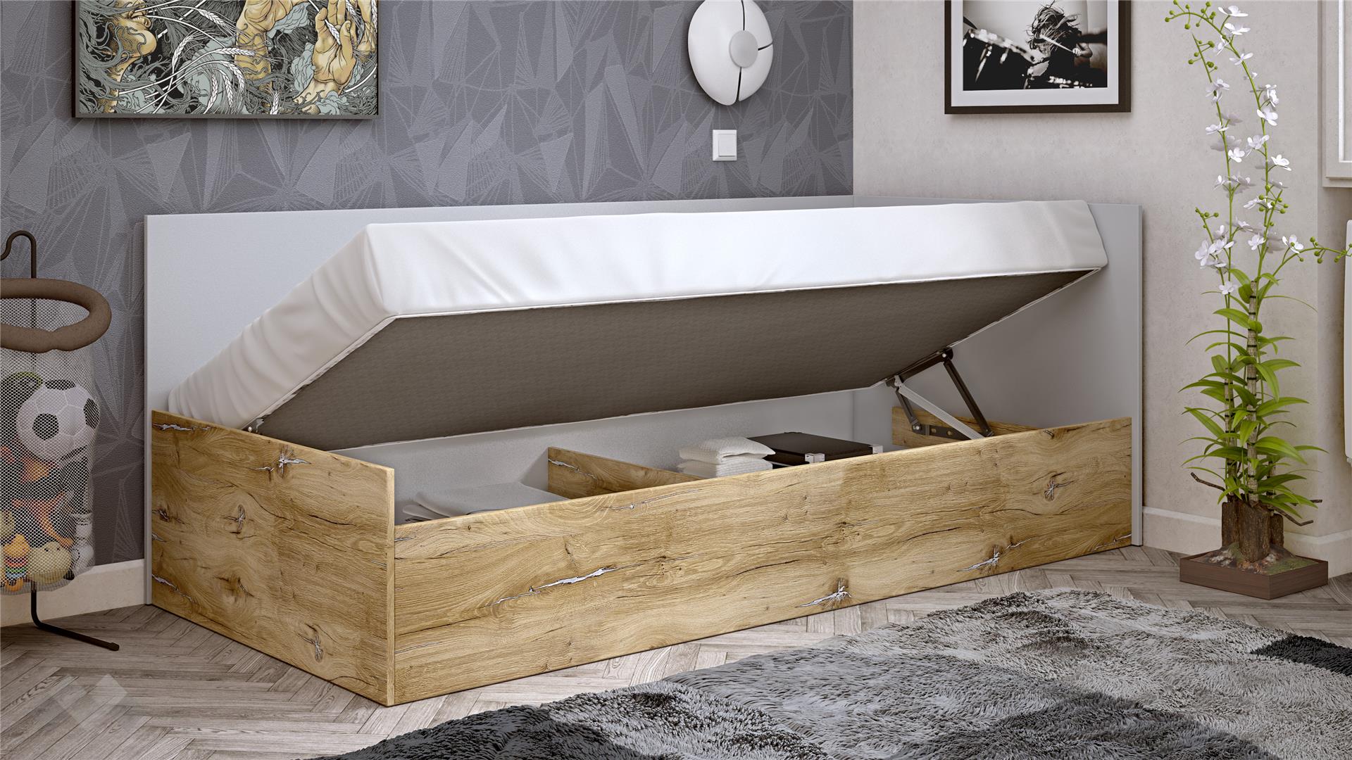 Леглото е проектирано с високи табли, които едновременно служат като облегалка и предпазват стената. С механизът за повдигане на матрака ти предоставяме изключително ценно допълнително място за съхранение на спално бельо, играчки, дрехи или други вещи, спомагайки за поддържане на реда в стаята.