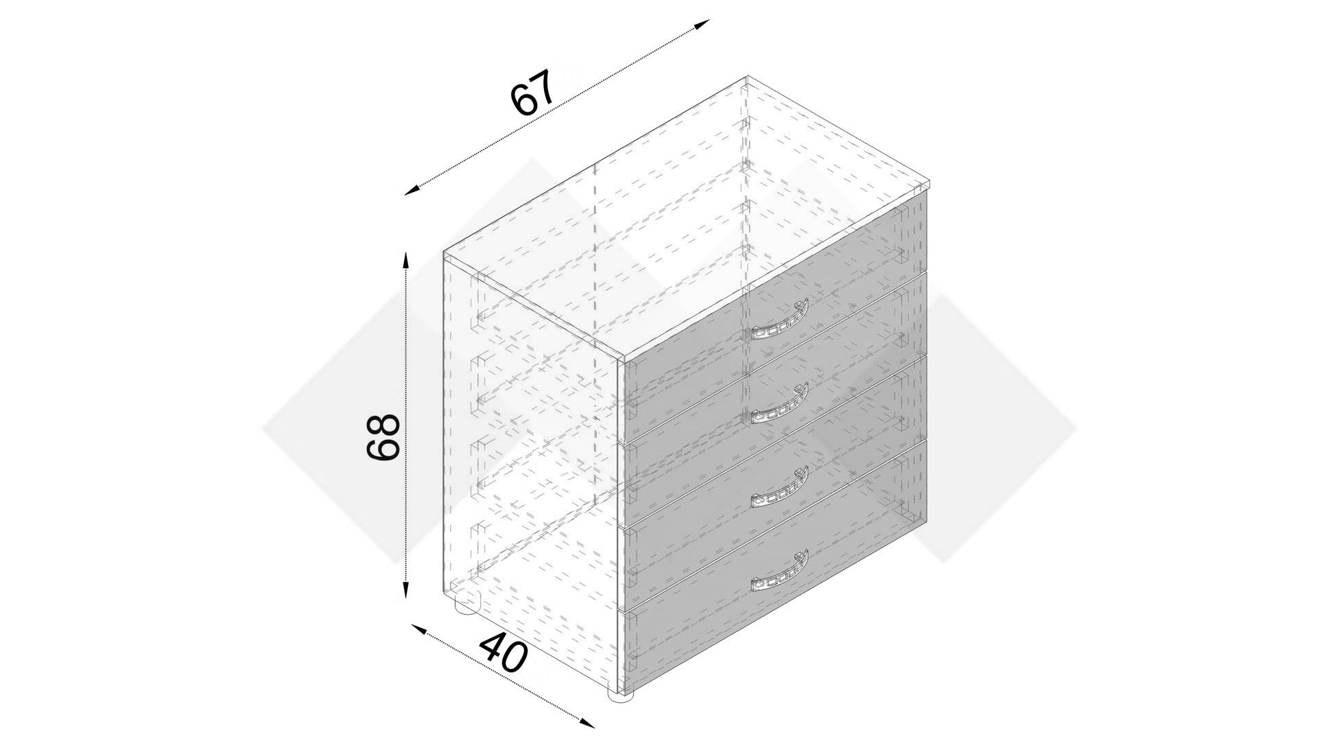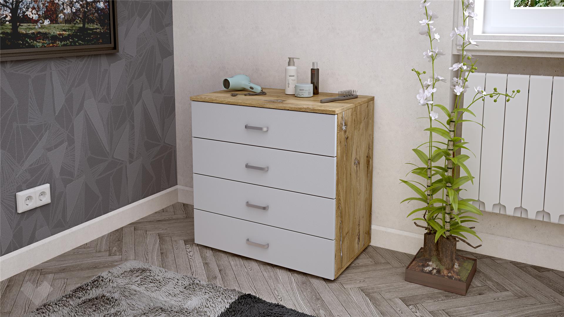 Четирите чекмеджета са удобни за подреждане на сгънати дрехи, обувки и кутии за съхранение. Просторния плот ти предоставя място за вещи, които да са ти винаги под ръка.