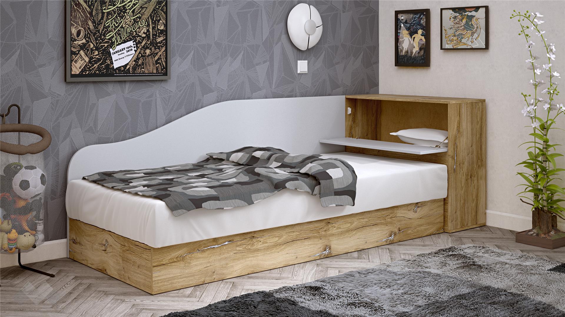Леглото е проектирано с извита, мека линия на таблата, която едновременно служи като облегалка и предпазва стената. С механизът за повдигане на матрака и компактната ракла ти предоставяме изключително ценно допълнително място за съхранение на спално бельо, играчки, дрехи или други вещи, спомагайки за поддържане на реда в стаята.
