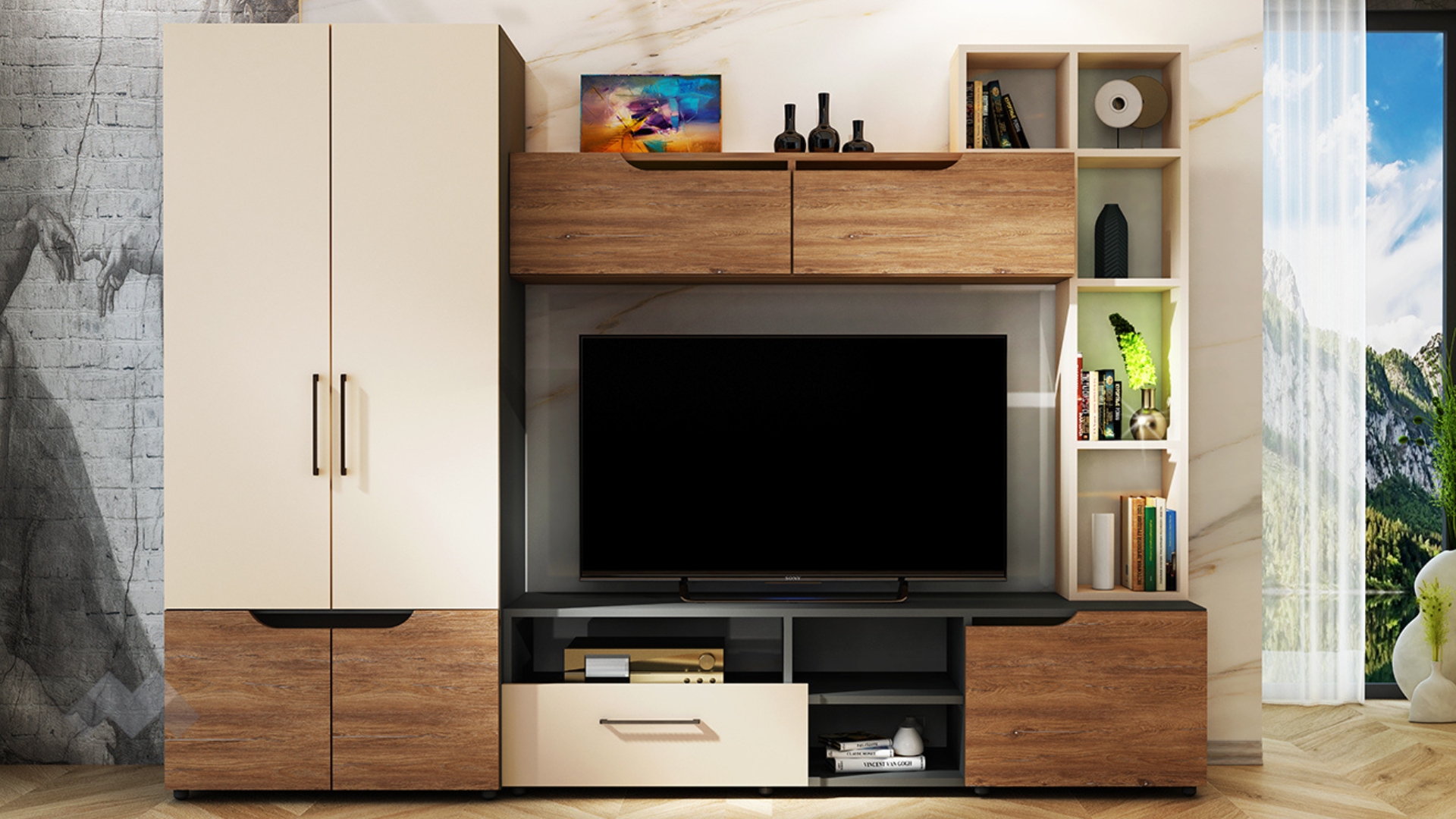 Основата на секцията представлява ТВ шкаф, състоящ се от шкаф с вратичка, отворени ниши, чекмедже и плот. Там можеш да поставиш цялата си съпътстваща техника като ТВ приемници, DVD плейъри или друга техника. Над мястото за телевизор са позиционирани шкафове, където да организираш още полезни за ежедневието вещи. Откритите рафтове са идеални за подреждане на книги, скъпи спомени като фотографии, любими сувенири или други декорации. Двукрилният гардероб разполага с лост за закачалки и два рафта, които ще ти предоставят достатъчно място за дрехи, спално бельо, възглавници и кутии за съхранение.