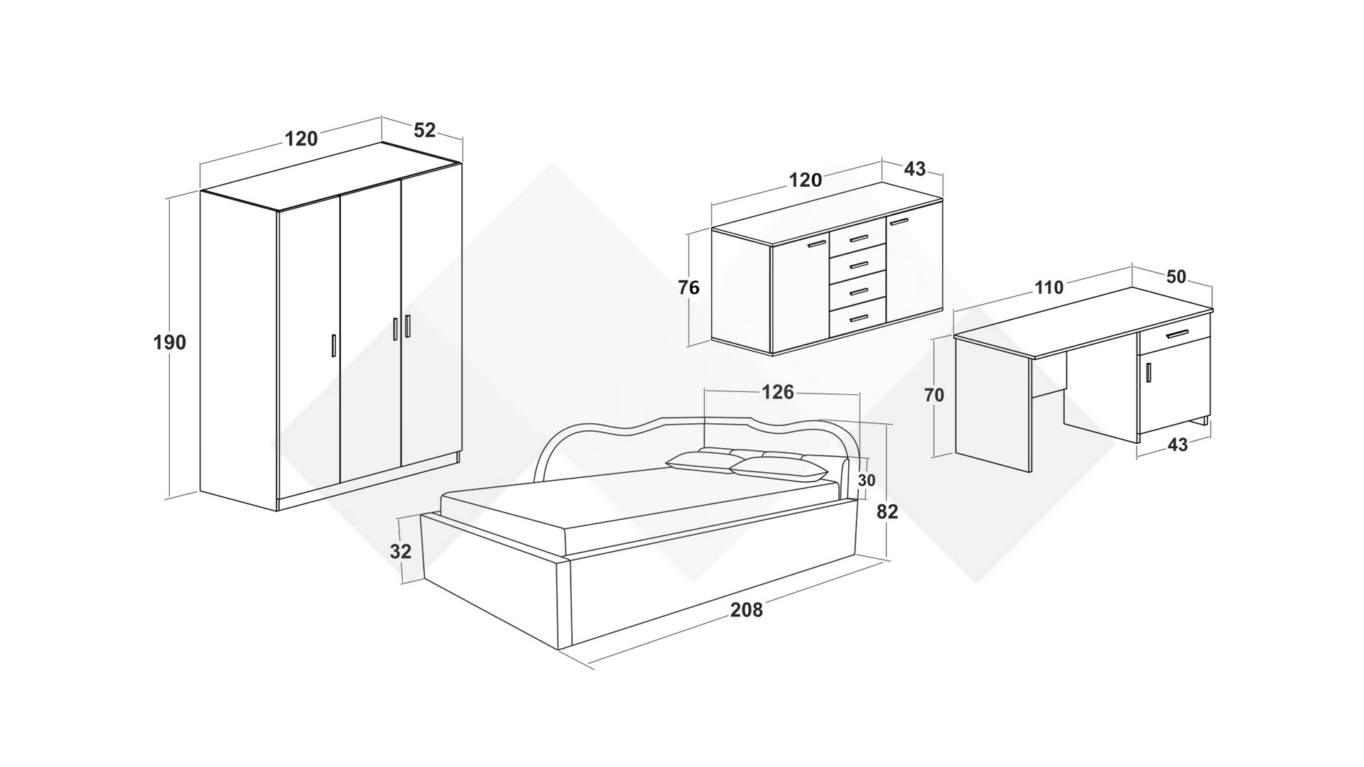 ✓ легло с тапицирана табла и основа ✓ трикрилен гардероб ✓ лост за закачалки  ✓ скрин с 4 чекмеджета и 2 шкафа ✓ бюро ✓ модерен дизайн ✓ елегантна визия ✓ повдигащ механизъм ✓ качествена изработка