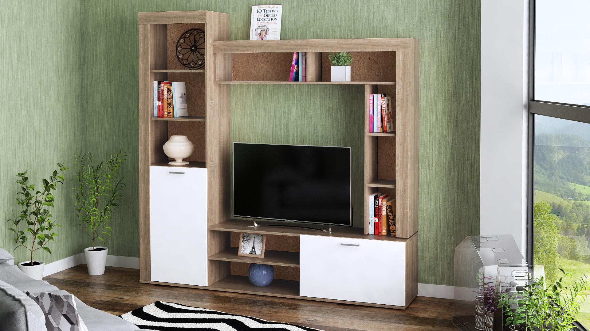 ⭐ Предимства: ✓ модерен дизайн ✓ ТВ шкаф ✓ висок шкаф ✓ етажерка ✓ отворени рафтове ✓ качествена изработка ✓ 16 мм ПДЧ
