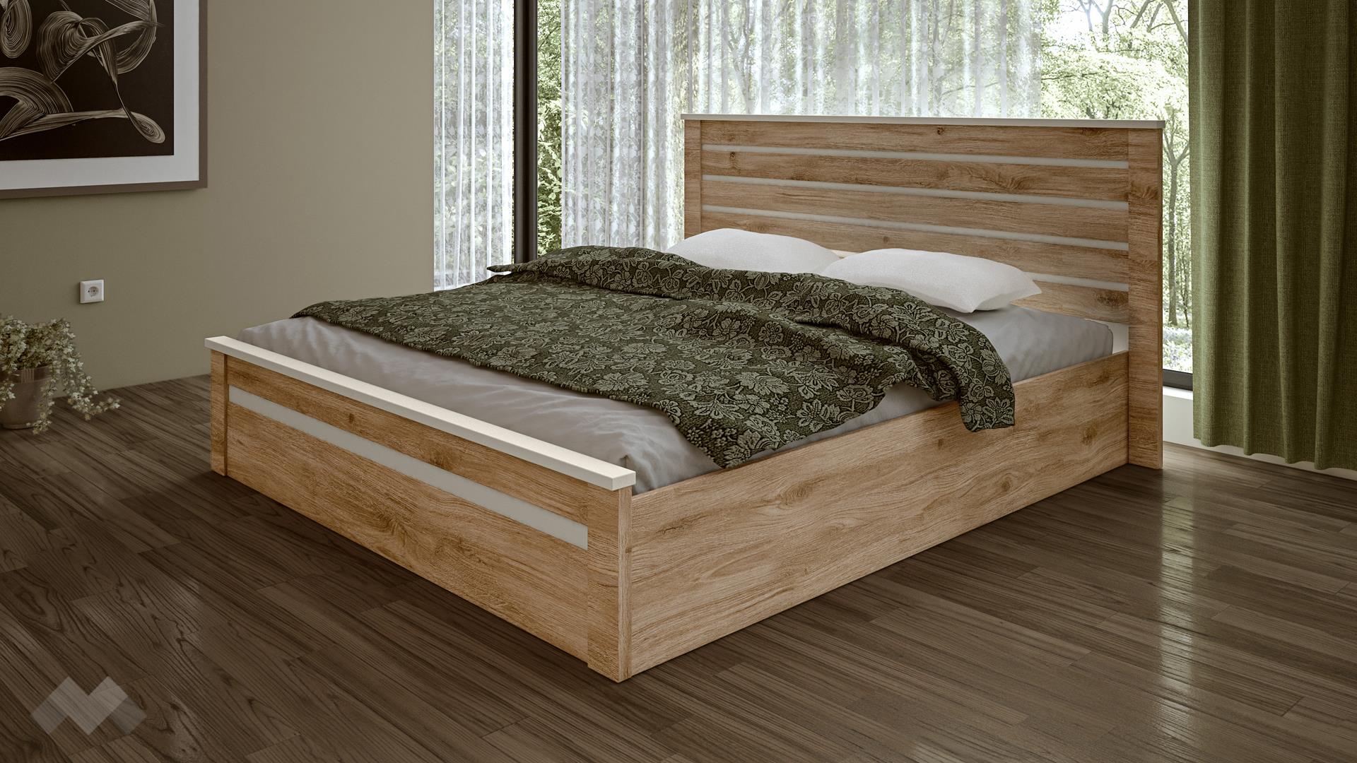 Високата и внушителна табла на леглото е с хоризонтални декоративни елементи в бяло гладко, които прекъсват дървесната текстура и добавят модерен, изчистен акцент. Тези бели линии придават визуална лекота и изтънченост. Леглото е стабилно и здраво, изработено от 18 мм ПДЧ и подходящо за матрак с размери 180/200, осигурявайки комфорт и дълготрайна употреба. Високата рамка на леглото допринася за монументалния му вид и осигурява добро разположение на матрака.