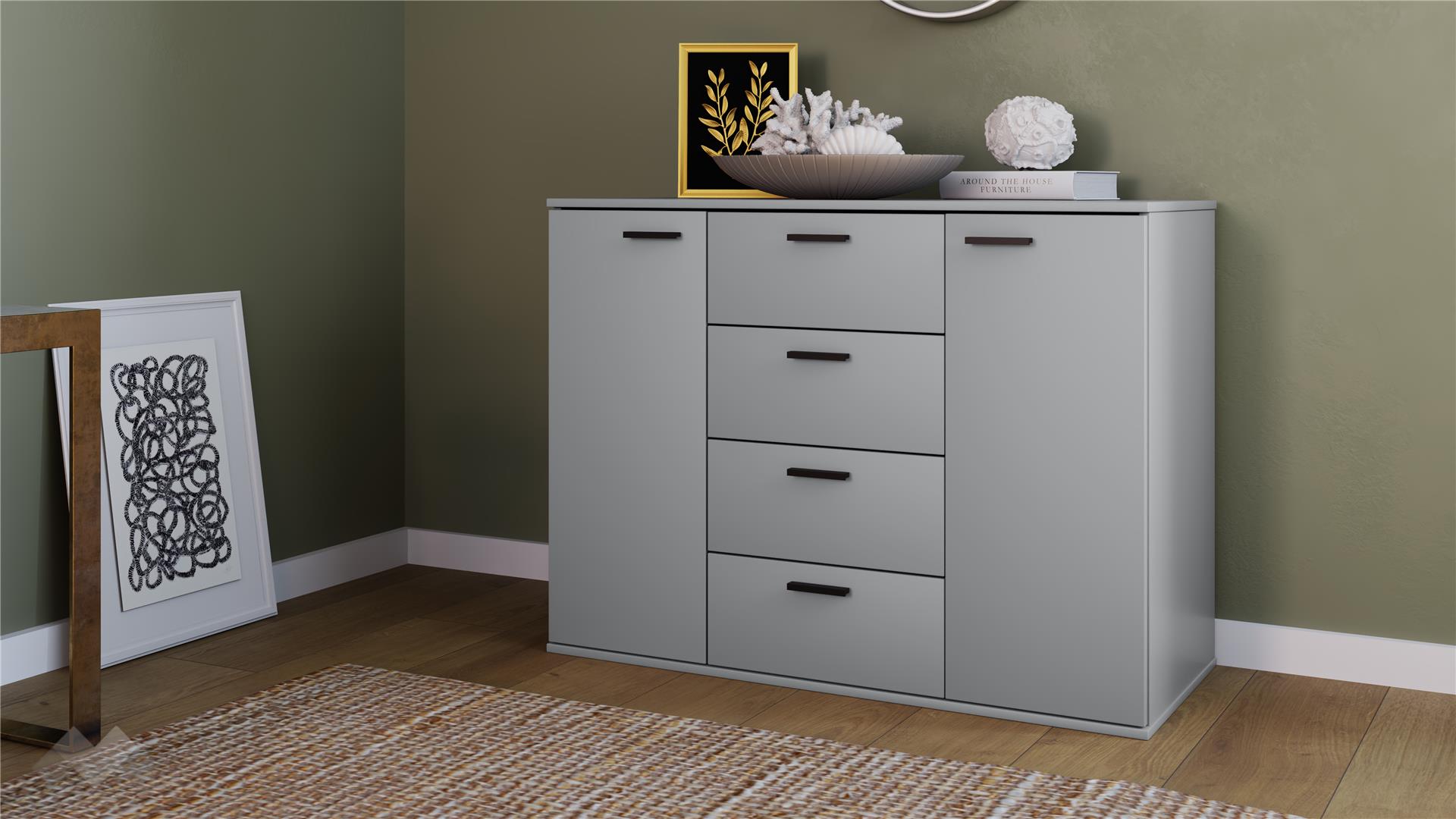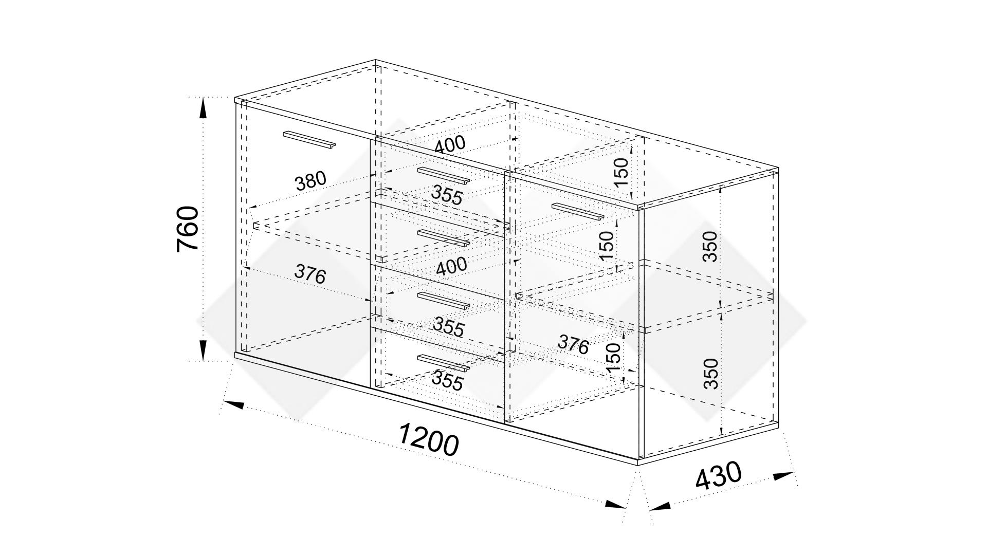 От двете страни на чекмеджетата се намират два шкафа, всеки с по един вътрешен рафт, където можеш да организираш сгънати дрехи, аксесоари или други необходими за теб неща. Просторният плот на скрина е идеален за подреждане на декорации, книги, козметика, бижута или други вещи, които искаш да ти бъдат винаги под ръка.