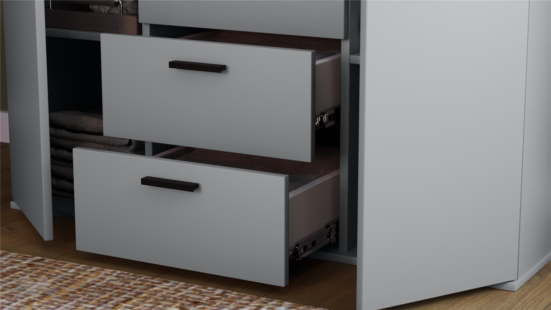 Скринът е снабден с четири чекмеджета, които са разположени вертикално и предоставят достатъчно място за съхранение на дрехи, спално бельо, аксесоари или документи. Те са снабдени със сачмени водачи с пълно изтегляне и плавно прибиране, характеризиращи се със стабилност, устойчивост и издръжливост при по-голямо натоварване.