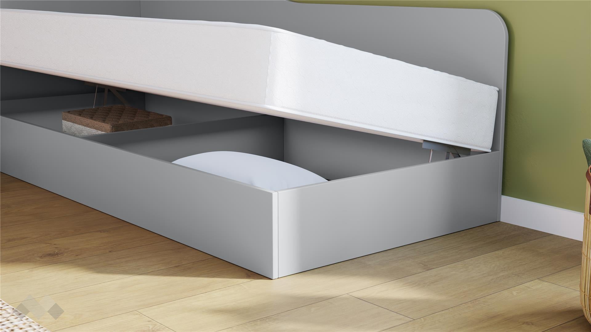 Подходящо за матрак с размери 82/190 см, леглото е идеално за детски стаи, гостни или малки спални. Леглото е с универсално разположение – по време на монтажа, изолиращата табла и механизма могат да се монтират отляво или от дясно, така че да пасне идеално на стаята. Включеният повдигащ пружинен механизъм осигурява лесен и бърз достъп до подматрачното пространство, което е перфектно за съхранение на спално бельо, играчки, сезонни дрехи и други вещи.