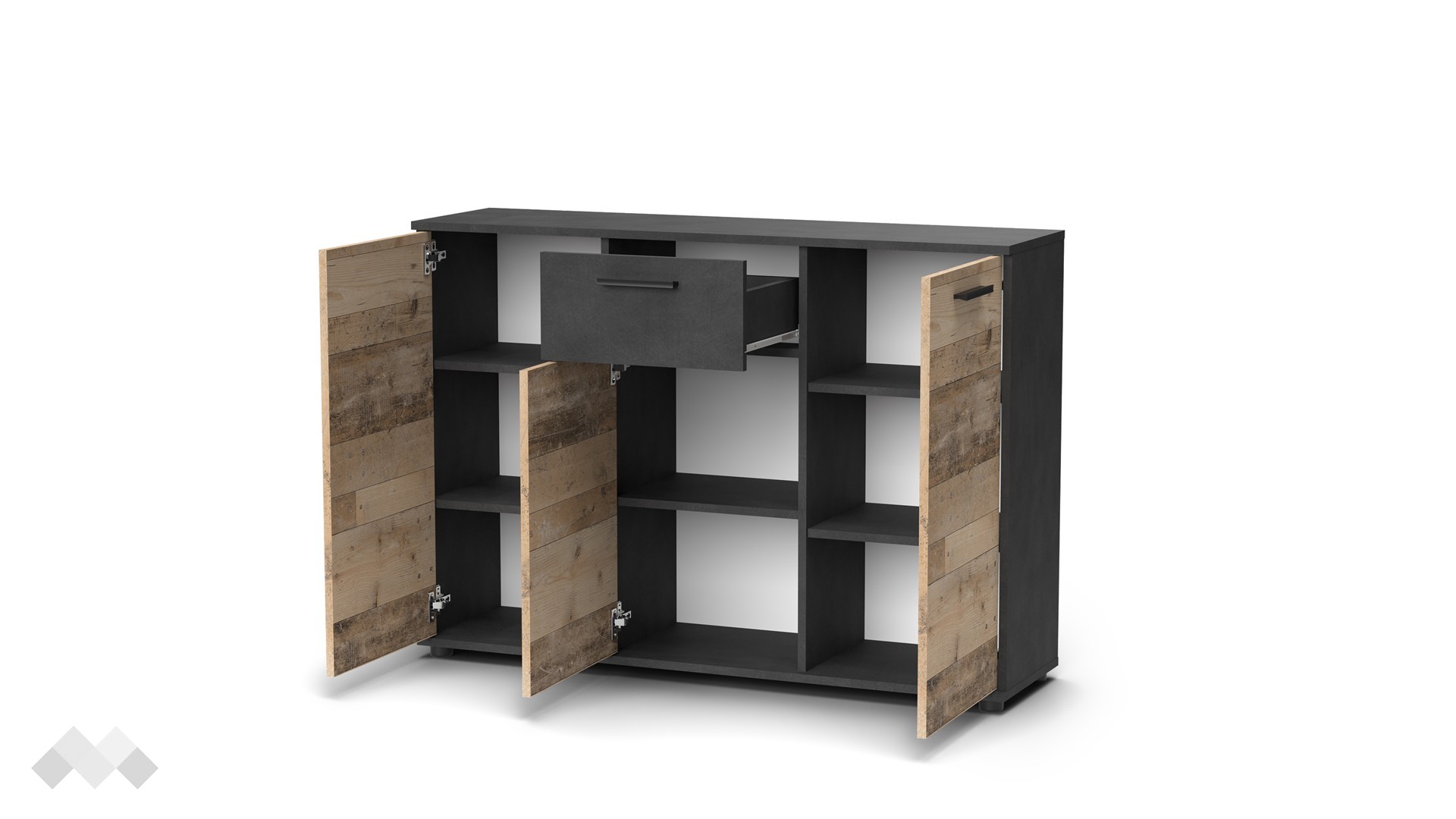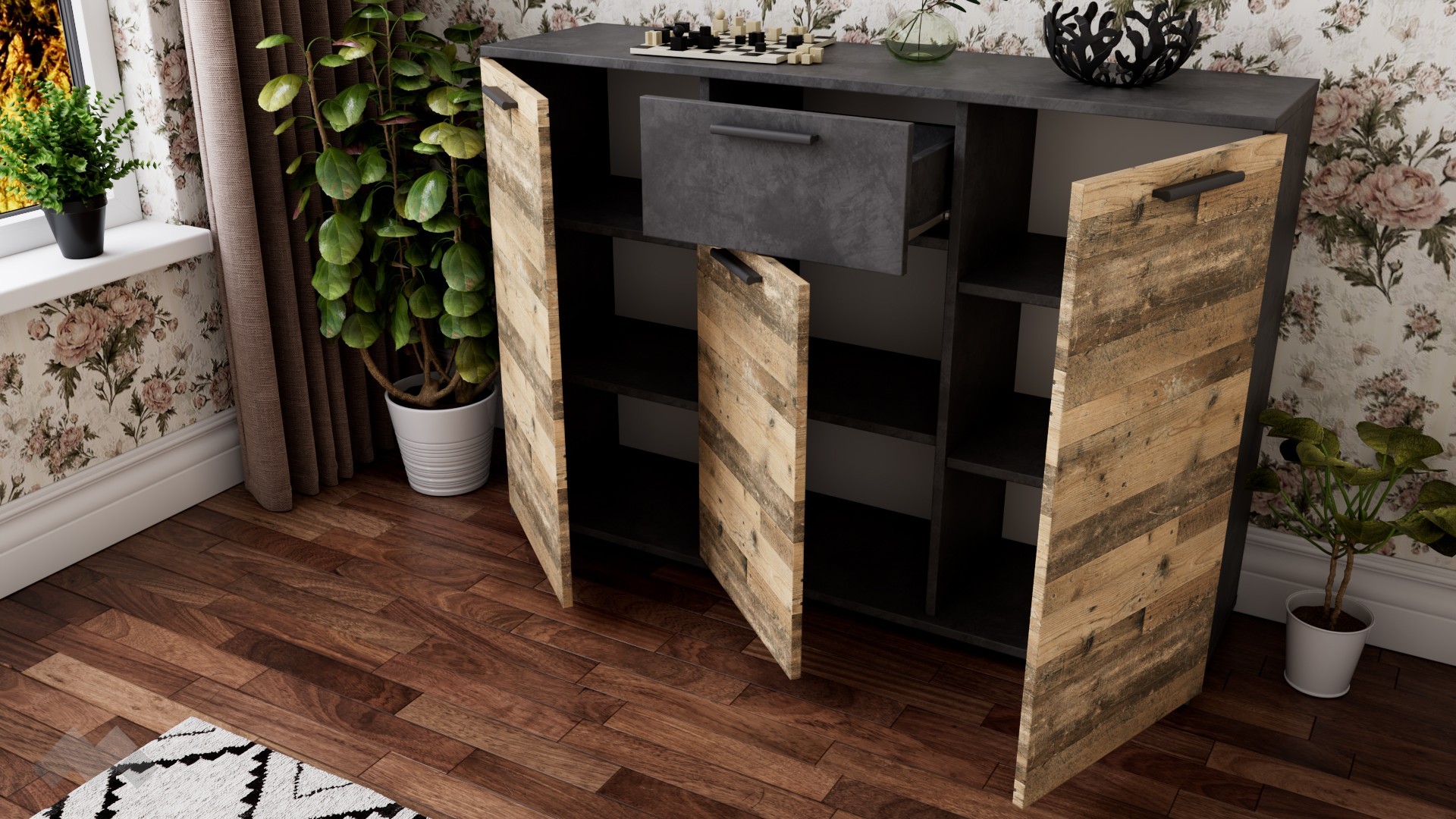 На твое разположение са чекмедже, затворен шкаф с един рафт и два затворени шкафа с по два рафта. Моделът е универсален и ще намери приложение във всяка стая. Можеш да го поставиш в спалнята, където да ти предостави допълнително място за дрехи и бельо, а върху горния плот може да подредиш козметика, аксесоари или ефектна декорация. Скринът може да бъде и чудесно допълнение към всекидневната, където да ти послужи за организиране на всички вещи, за които не намираш място в секцията. Ако имаш нужда от допълнително място за обувки и аксесоари, можеш да го поставиш и в антрето.