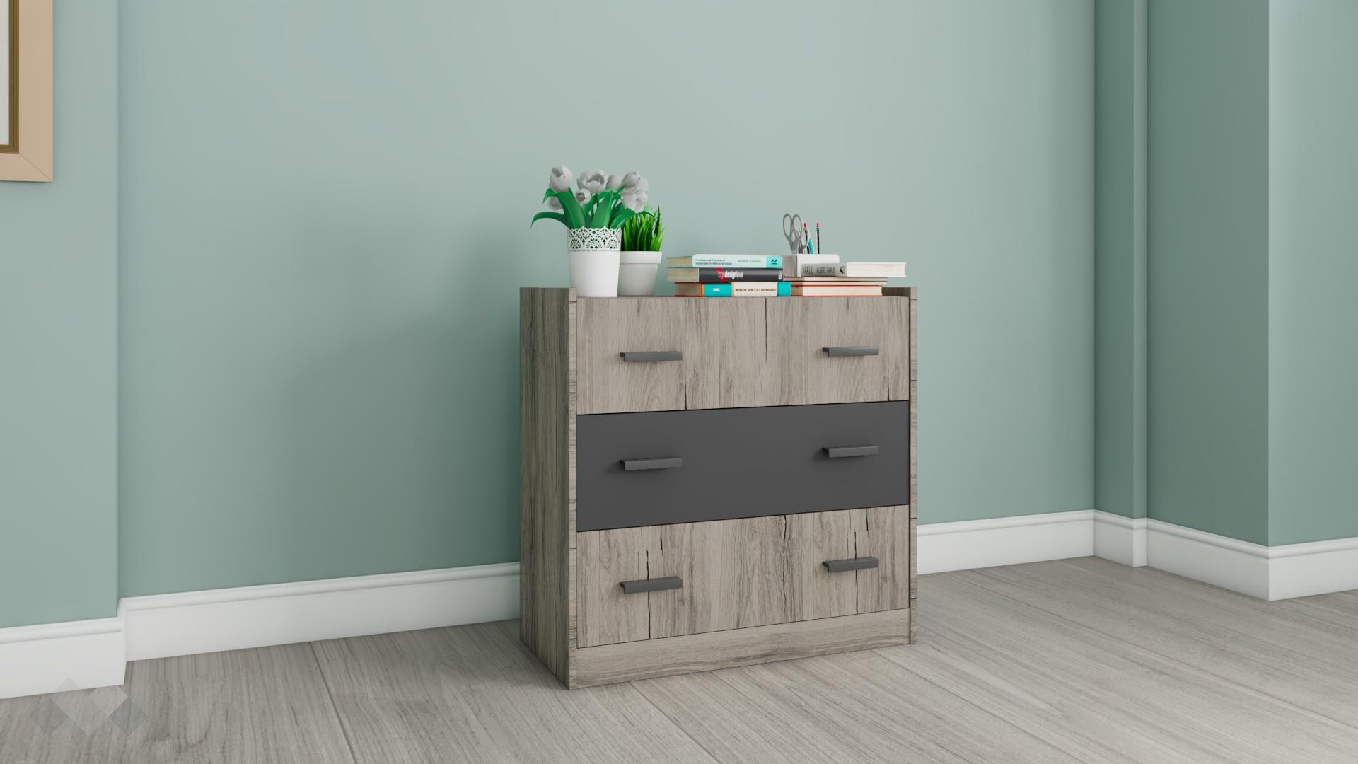 ✓ 3 чекмеджета ✓ компактен и практичен ✓ модерен винтидж декор с WNR структура ✓ качествена изработка ✓ 16 мм ПДЧ
