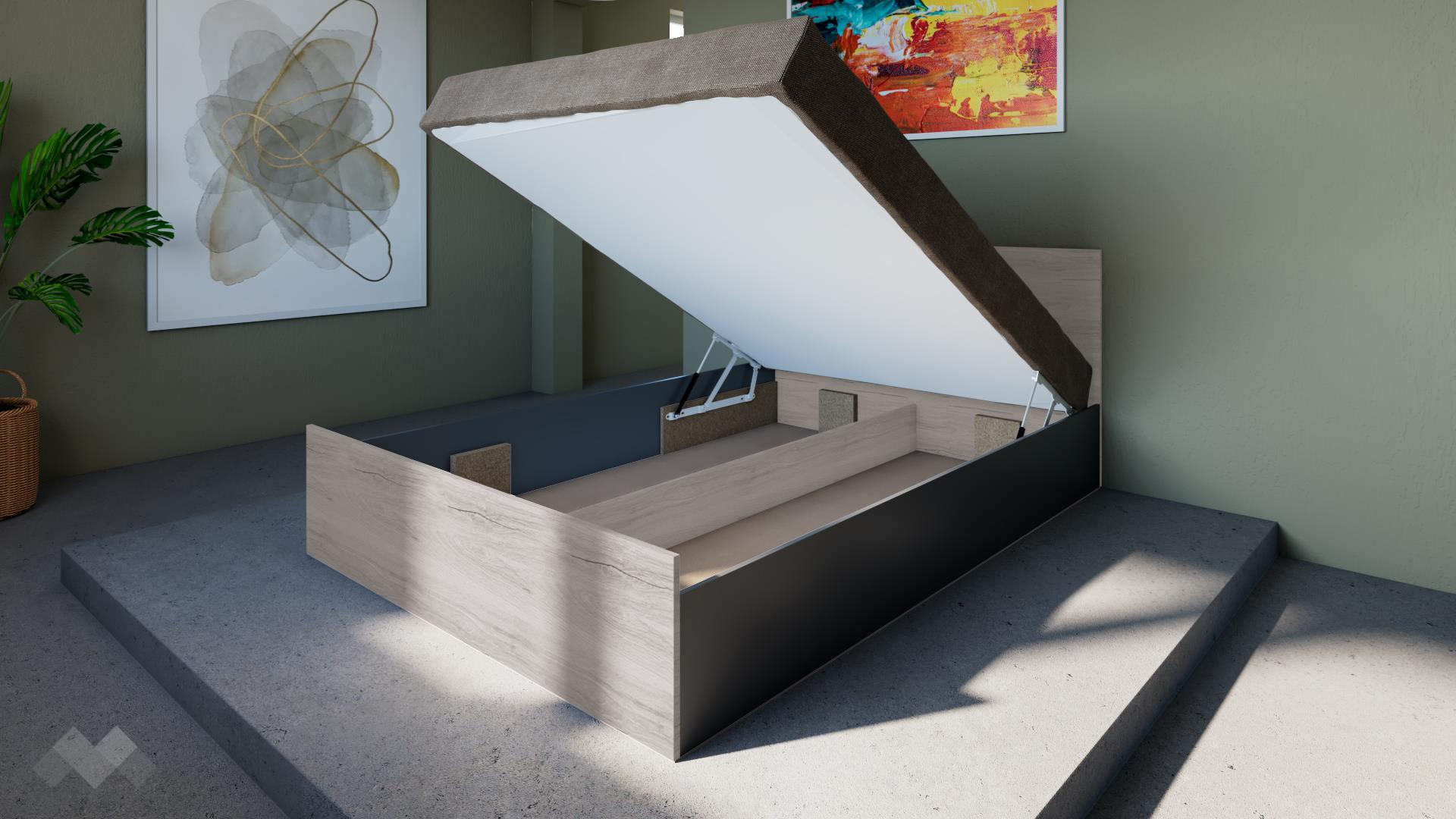 Спалнята е с включен механизъм за повдигане на матрака, за да използваш пространството под матрака като допълнително място за съхранение.