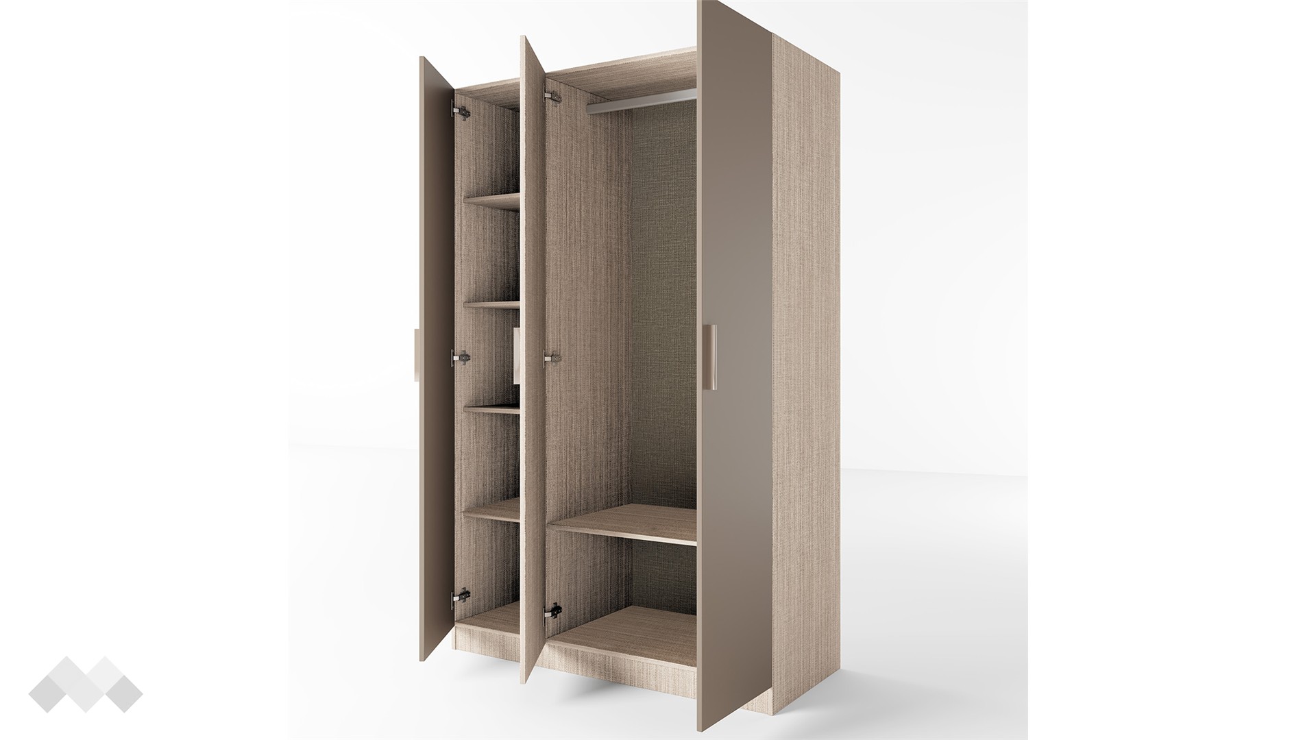 Гардероб Спрингфийлд добре се съчетава както с цветове в сивата, така и с цветове в кафявата гама. Той е трикрилен, с 5 рафта и лост за закачалки. Има добре обмислено разпределение, което ще ти позволи да подредиш добре всички свои дрехи и аксесоари прилежно. Можеш да използваш рафтовете за съхранение на сгънати дрехи, а на лоста да закачиш всичко, което искаш да ти бъдат бързо под ръка.