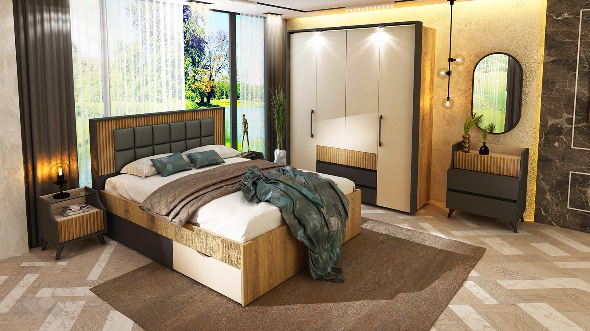 Основният акцент е спалнята, подходяща за матрак 160/200 с висока и тапицирана табла, осигуряваща комфорт при облягане. Текстилната тапицерия в сив цвят подчертава луксозното излъчване на леглото.В основата му са вградени две практични чекмеджета, които предоставят допълнително място за съхранение на спално бельо, одеяла или други вещи.