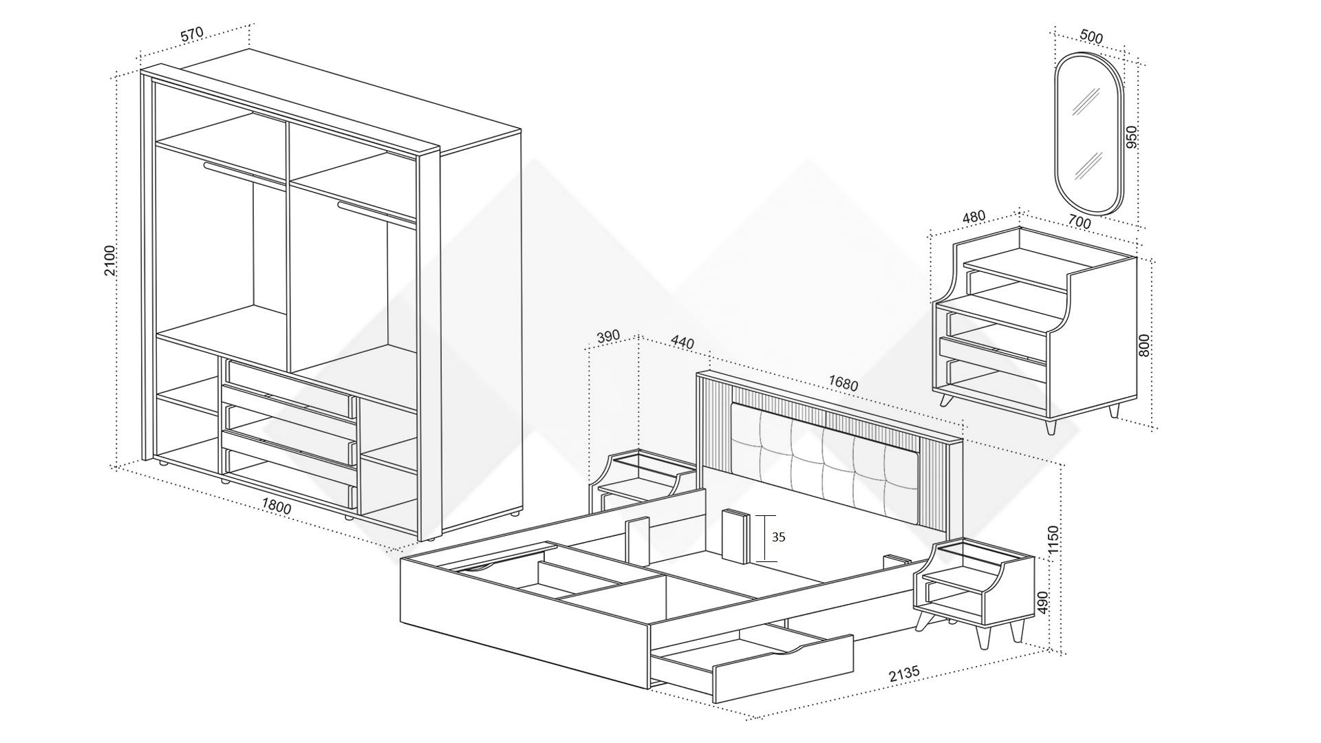 ✓ спалня с 2 чекмеджета ✓ 2 нощни шкафчета ✓ четирикрилен гардероб с 3 чекмеджета и врати “хармоника” ✓ скрин ✓ огледало ✓ механизми за плавно затваряне на вратите ✓ телескопични водачи с пълно изтегляне ✓ LED осветление ✓ модерен декор ✓ качествена изработка ✓ 16 мм ПДЧ и МДФ