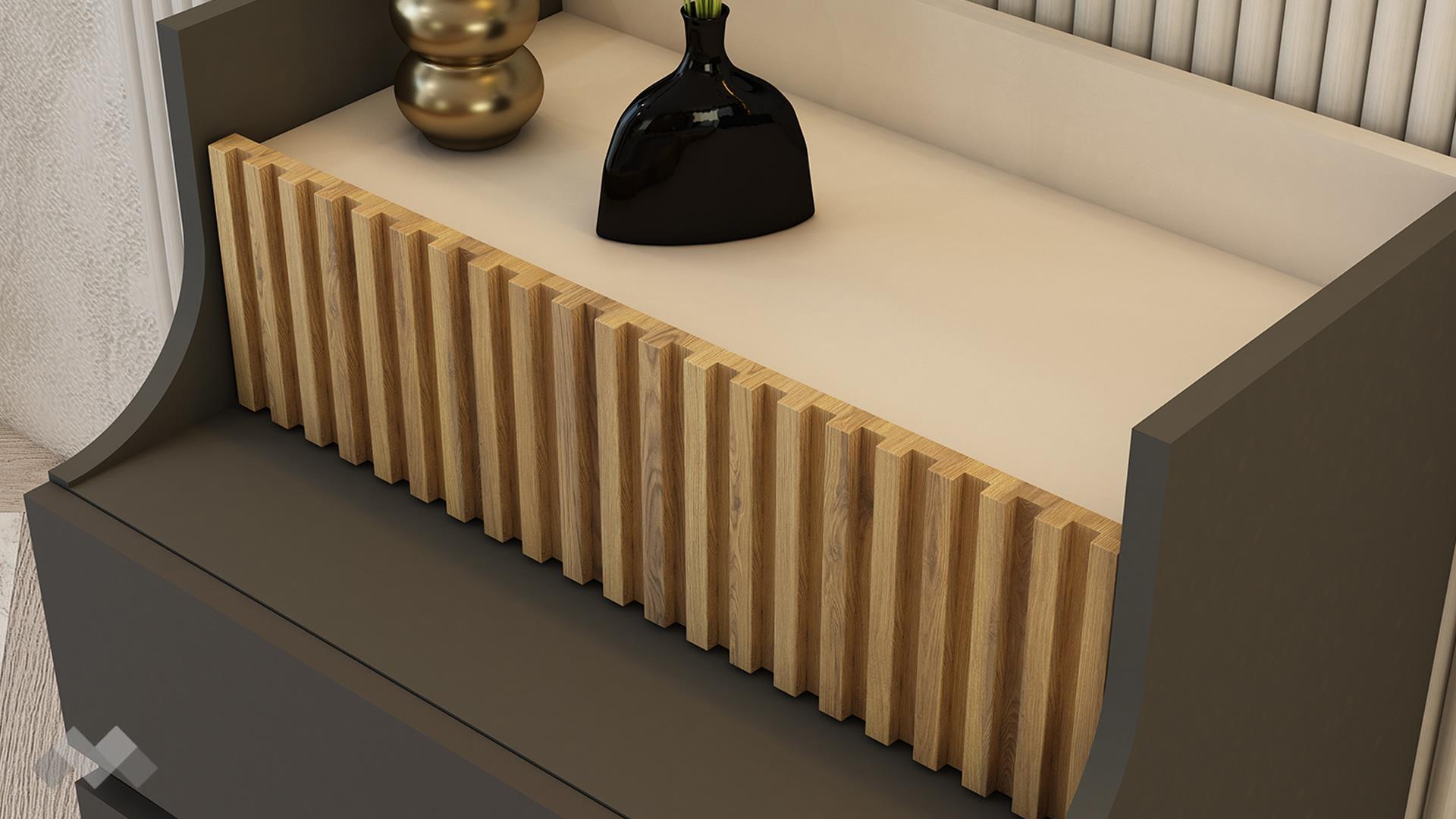 Двете нощни шкафчета с чела от релефен МДФ и телескопични водачи при чекмеджето допълват композицията с удобство и симетрия. Те съчетават чекмедже и плот, като предлагат място за лични принадлежности, осветление или декоративни елементи.