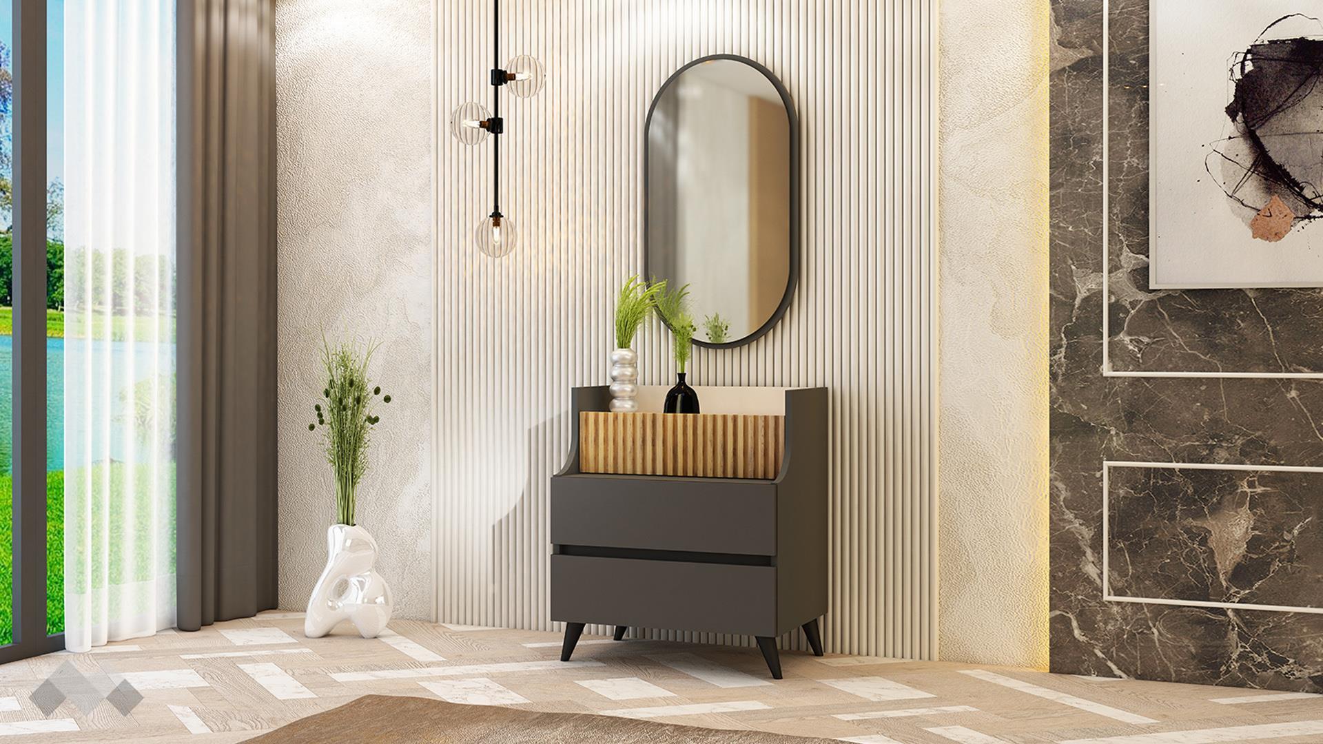 Скринът с три чекмеджета и огледало е не само практично, но и стилно допълнение към комплекта. Предоставя достатъчно място за козметика, аксесоари и бельо, докато огледалото добавя светлина и дълбочина в пространството.