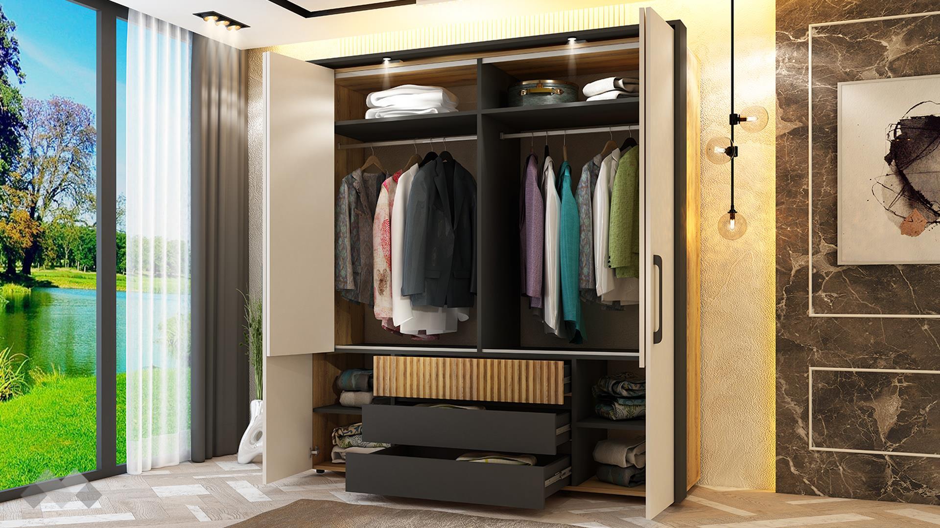 Впечатляващият четирикрилен гардероб с три чекмеджета осигурява изобилие от пространство за съхранение. С вътрешно разпределение от рафтове, лостове и чекмеджета, той е изключително функционален, а вратите в кашмири челата на чекмеджетата в дъб евок и графит, създават елегантен и балансиран визуален ефект.LED осветлението над вратите придава допълнителна елегантност и практичност, особено при слаба осветеност. Вратите на гардероба с механизъм “хармоника” и механизъм за плавно затваряне, а чекмеджетата са с телескопични водачи позволяващи пълно изтегляне.