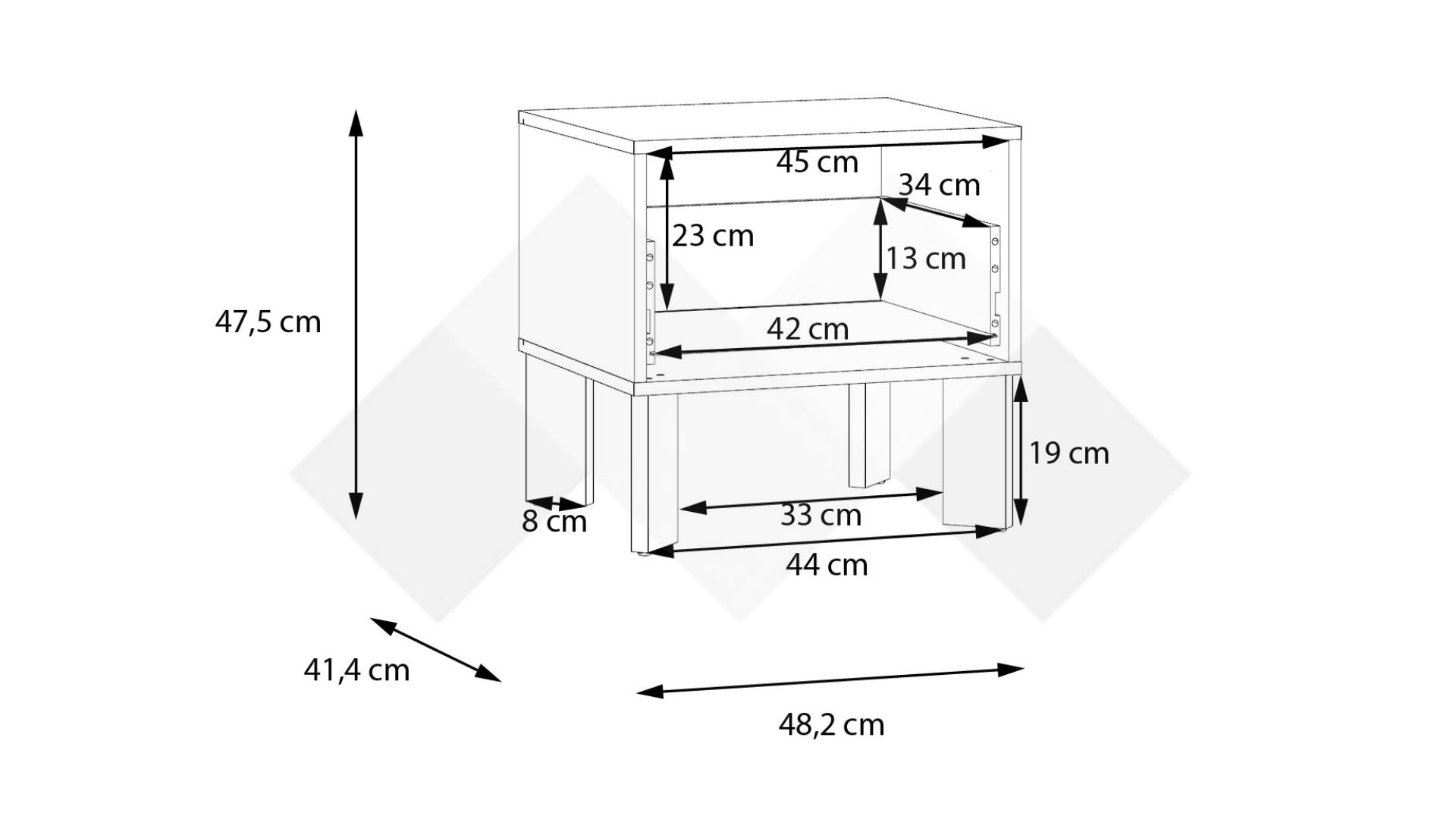 Нощно шкафче Тахо е стилно и функционално допълнение към всяка спалня. Със своя изчистен дизайн и компактни размери, то се вписва лесно до всяко легло, осигурявайки удобно място за най-необходимите вещи.