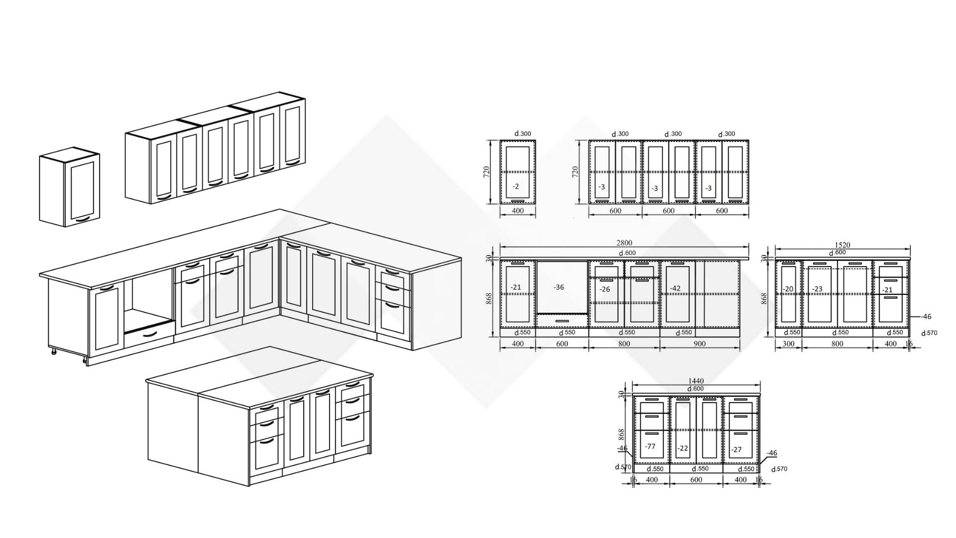 Горния ред шкафове са удобни и функционални, за най-често използваните уреди и посуда. Шкаф за вграждане на фурна. Долния ред шкафове е функционално подбран - перфектната комбинация на шкафове с рафтове и чекмеджета, за да поберат често използваните уреди, подправки и посуда. Островът - допълнително място за съхранение, още площ за работа и място за сладки приказки и хапване.