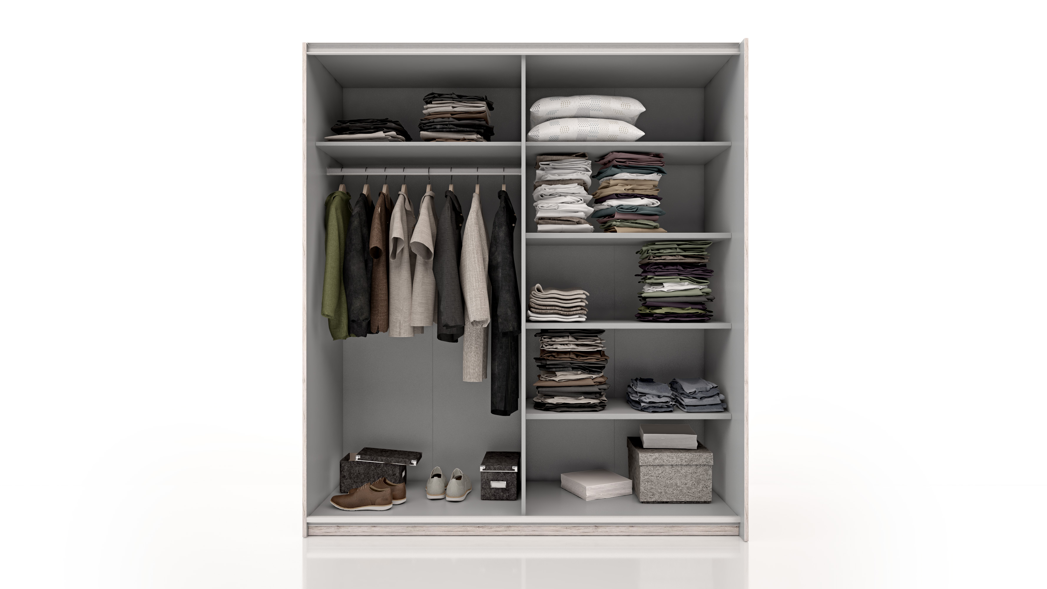 Вътрешното разпределение предлага лост за закачалки – идеален за палта, ризи и рокли, както и рафтове, които предоставят място за сгънати дрехи, аксесоари или кутии за съхранение. Едната половина на гардероба е изцяло с рафтове, което го прави още по-функционален при подреждането на дрехи и вещи.