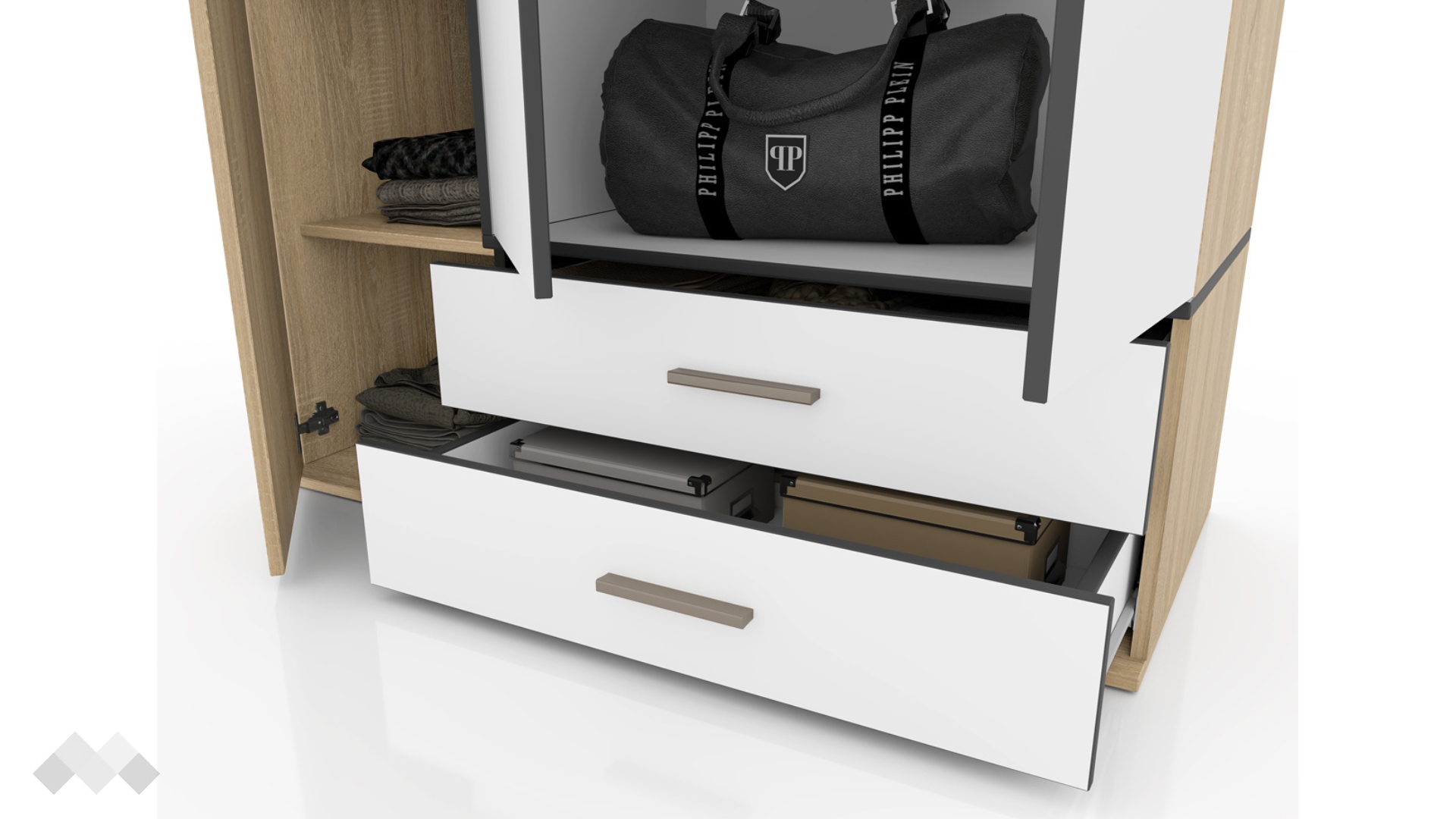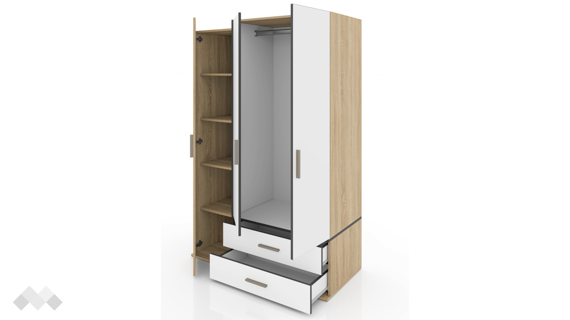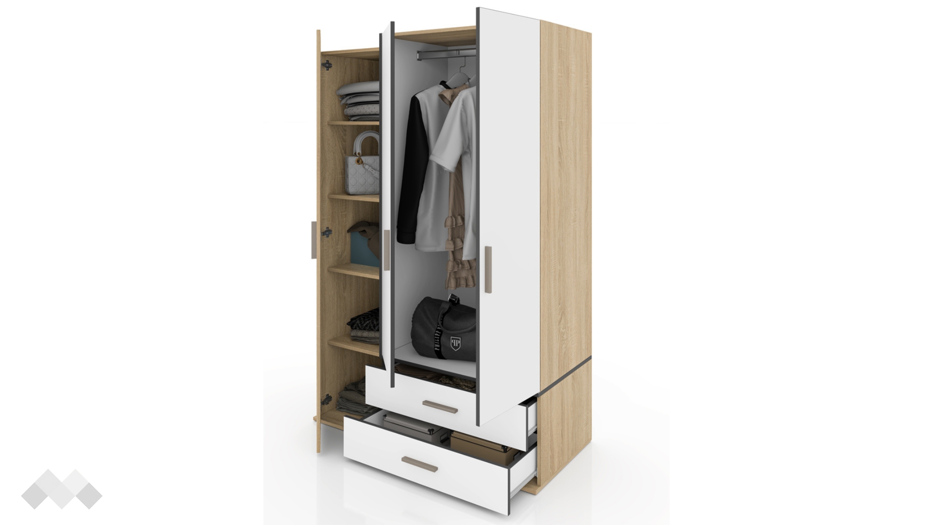 ⭐ Предимства: ✓ трикрилен ✓ 5 рафта ✓ лост за закачалки ✓ 2 чекмеджета ✓ практично разпределение ✓ композиция с принт ✓ плавно затваряне ✓ модерен декор ✓ качествена изработка ✓ 16 мм ПДЧ