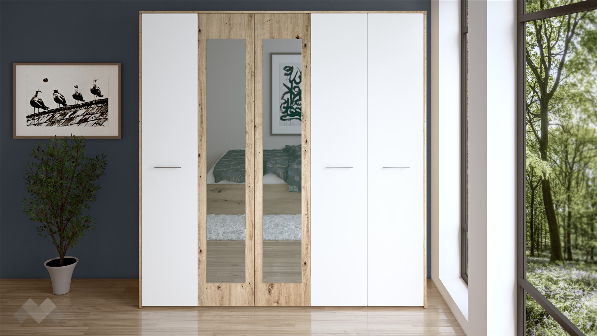 Искаш да създадеш хармоничен и натурален интериор в спалнята, който да създава усещане за уют, комфорт и неподправеност? Петкрилен гардероб Вангард е перфектното съчетание на семпъл и изчистен дизайн в комбинация от цвят артизан с бяло, носещ асоциации на близък до природата дизайн.
