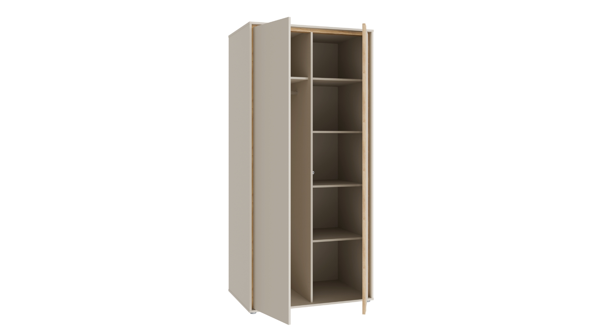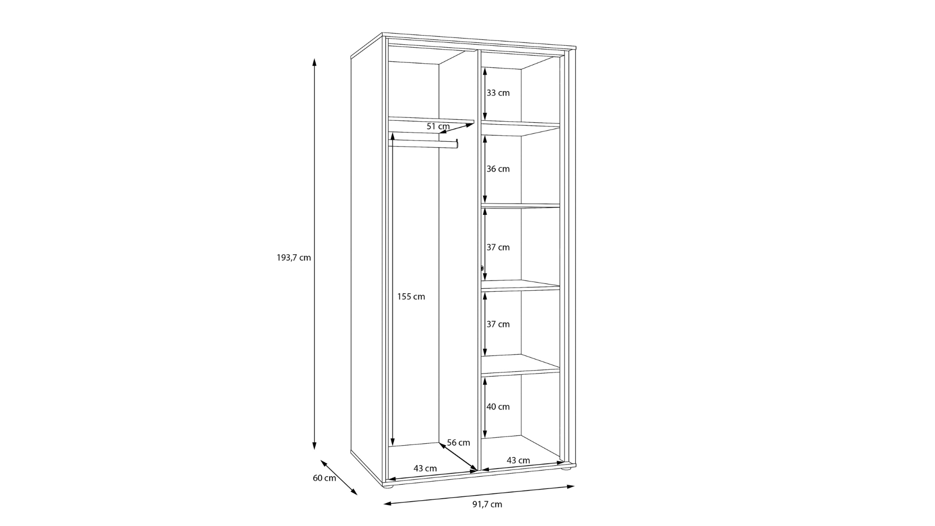 Този гардероб впечатлява със своето оптимално разпределение на вътрешното пространство. Разполага с общо 5 рафта, които осигуряват достатъчно място за подреждане на сгънати дрехи, спално бельо, кутии и други вещи. В допълнение, гардеробът включва лост за закачалки, идеален за съхранение на по-дълги дрехи като рокли, палта или костюми, предпазвайки ги от намачкване.