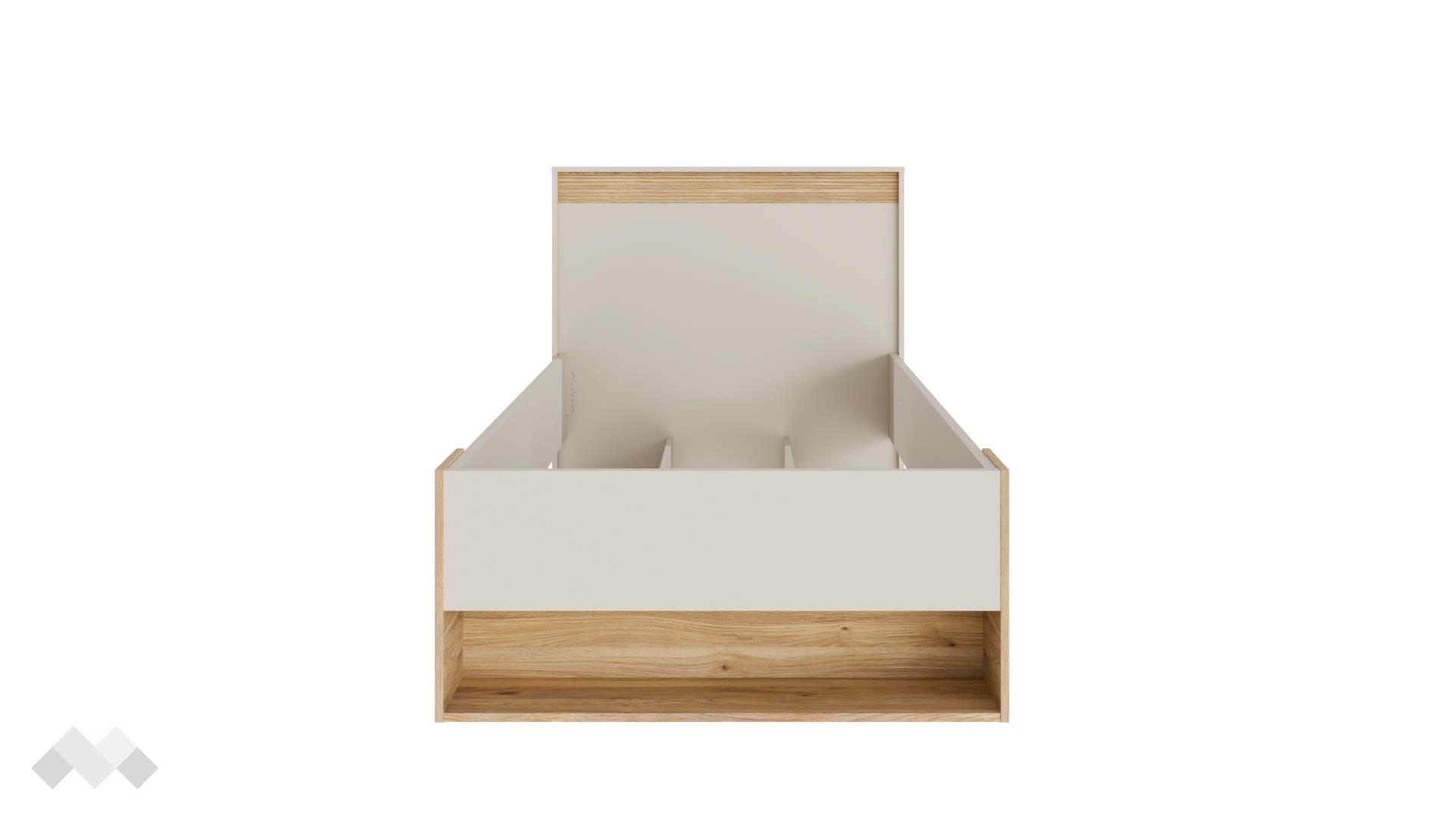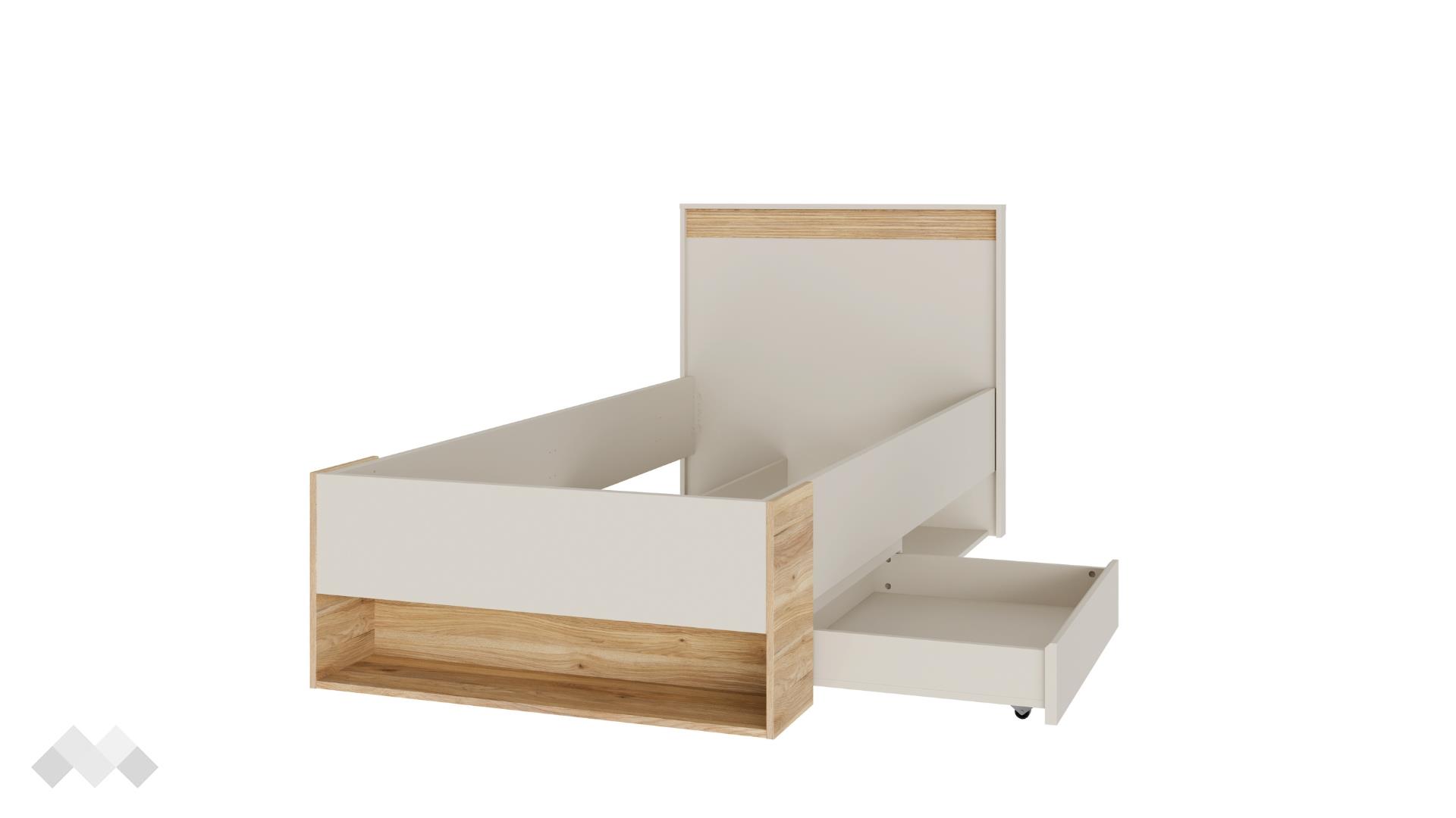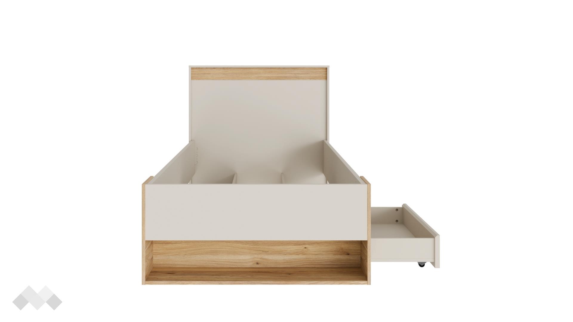 Леглото е проектирано за еднолицев матрак с размер 90/200 см, осигурявайки комфорт и удобство за сън. Едно от основните предимства на модела е вграденото чекмедже под матрака, което предоставя изключително удобно и дискретно място за съхранение на спално бельо, играчки, книги или други вещи, оптимизирайки пространството в стаята. Чекмеджето е снабдено с пуш механизъм, осигуряващ леко и безшумно отваряне и затваряне с едно натискане, което допринася за изчистения дизайн без дръжки.
