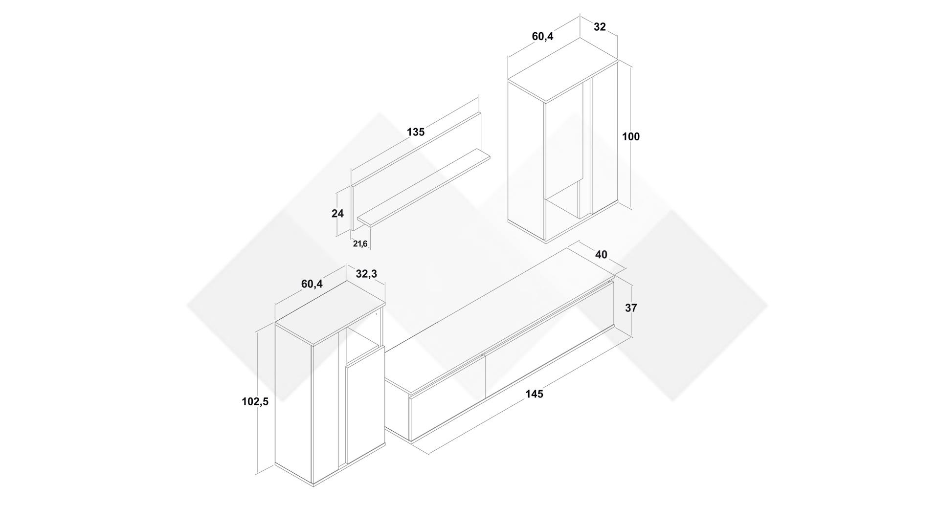 Окачен шкаф: Д: 60,4 см. Ш: 32 см. В: 100 см.