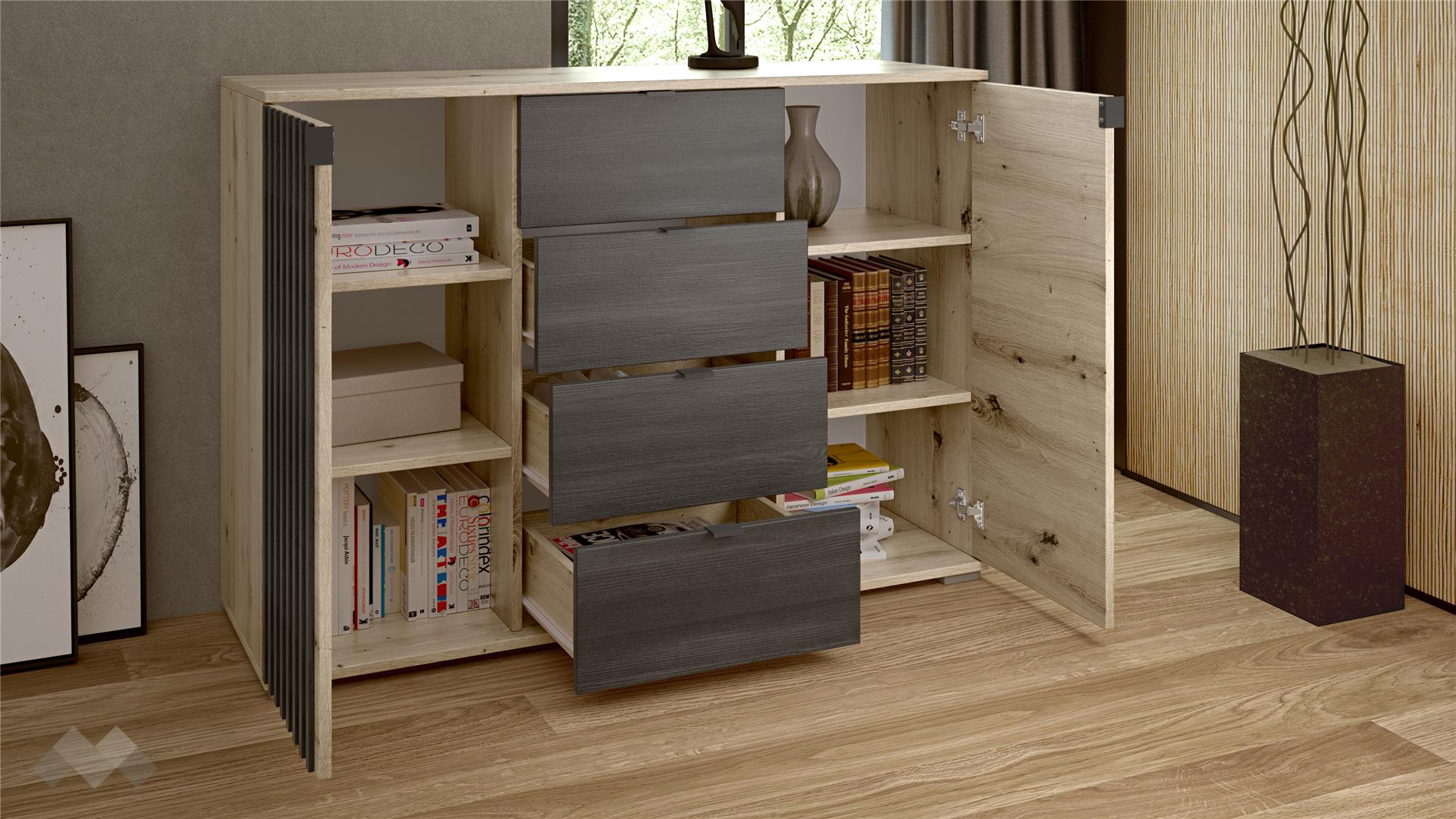 Скринът е изключително функционален - разполагаш с две врати, като зад всяка ще откриеш по два рафта, достатъчно широки и дълбоки за съхранение на малки електроуреди или дрехи. Между вратите има четири чекмеджета, които отново може да използваш да съхраниш вещите си.