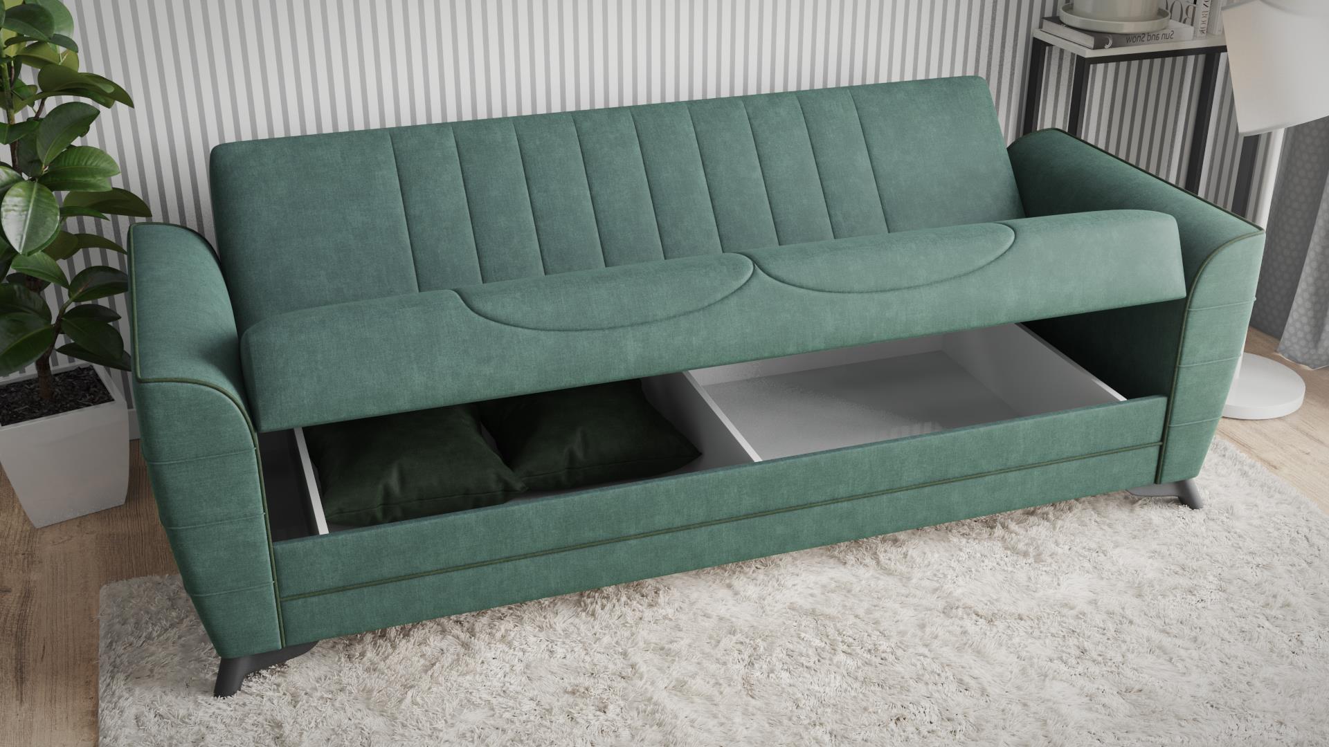 Диван Ялта е и функционален – с минимално усилие, за миг се превръща в широко легло, благодарение на клик-клак механизма, а под седалката се крие просторна ракла, където да съхраняваш завивки, възглавници и други вещи. Дамаската е приятна на допир, изработена от здрав, устойчив на износване и замърсявания текстил, а цветът допринася за неговата уникална идентичност.