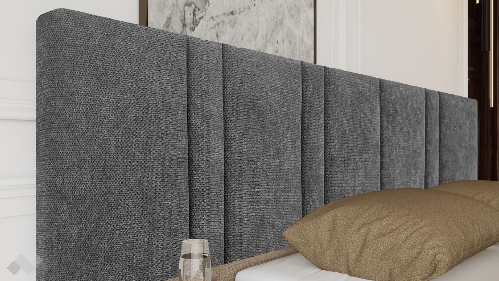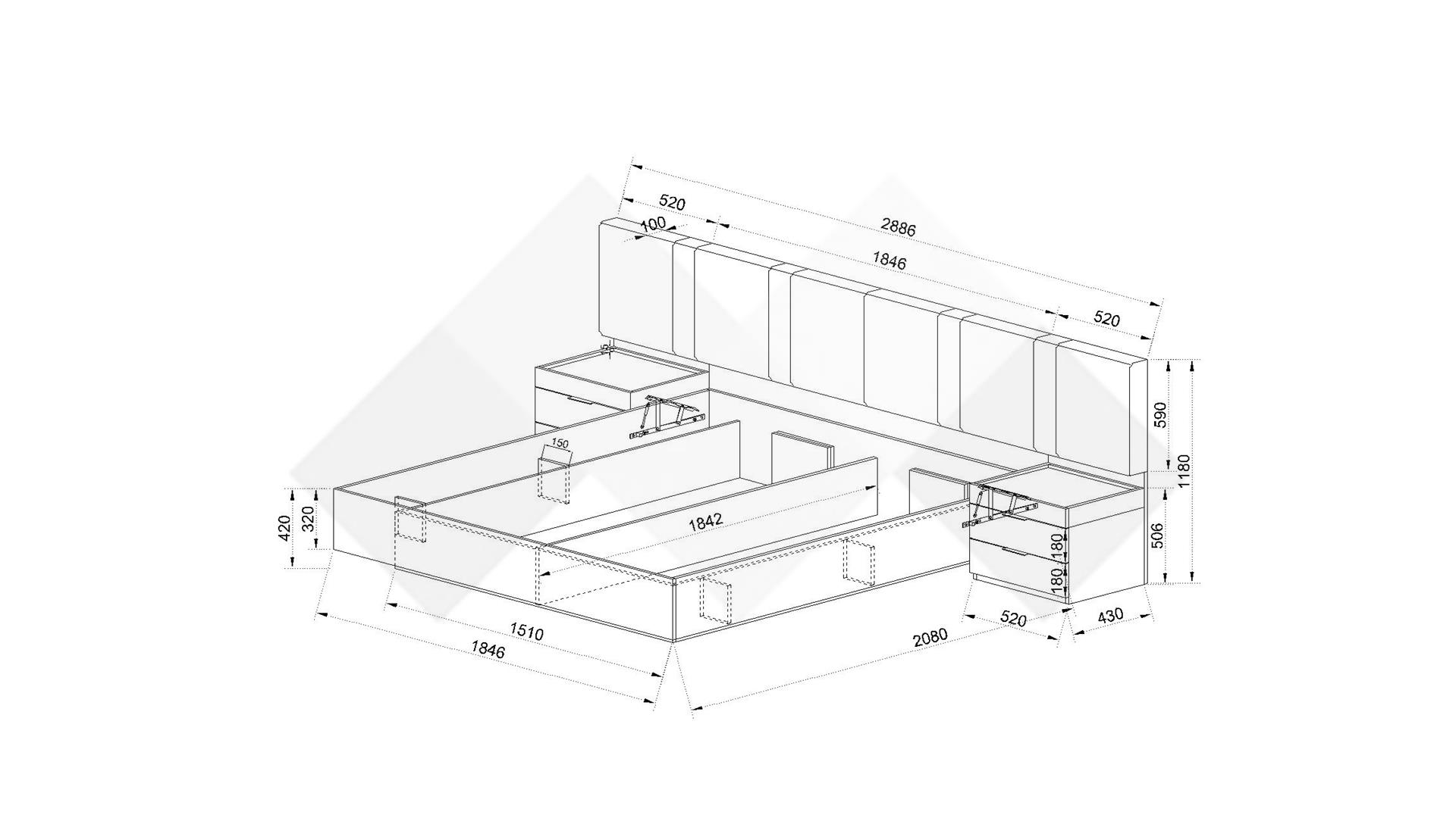 От двете страни на леглото са разположени стилни нощни шкафчета, които допълват цялостния дизайн. Те са с изчистени линии и минималистичен дизайн, съчетаващи функционалност и елегантност. Шкафчетата предоставят удобно място за съхранение на книги, лампи, будилници или лични вещи като същевременно добавят симетрия и баланс към интериора. Монтират се по интересен начин - към таблата на леглото.