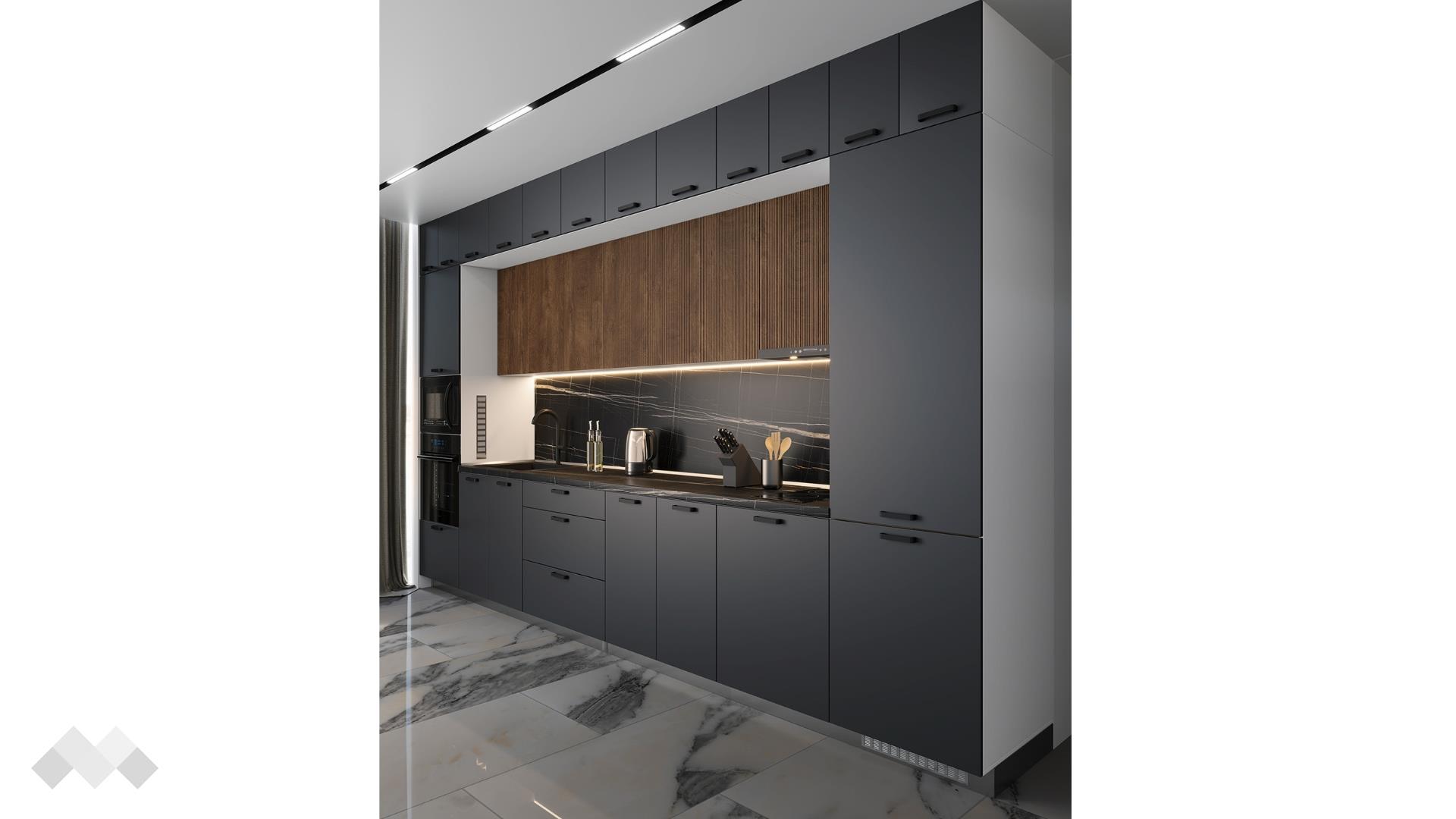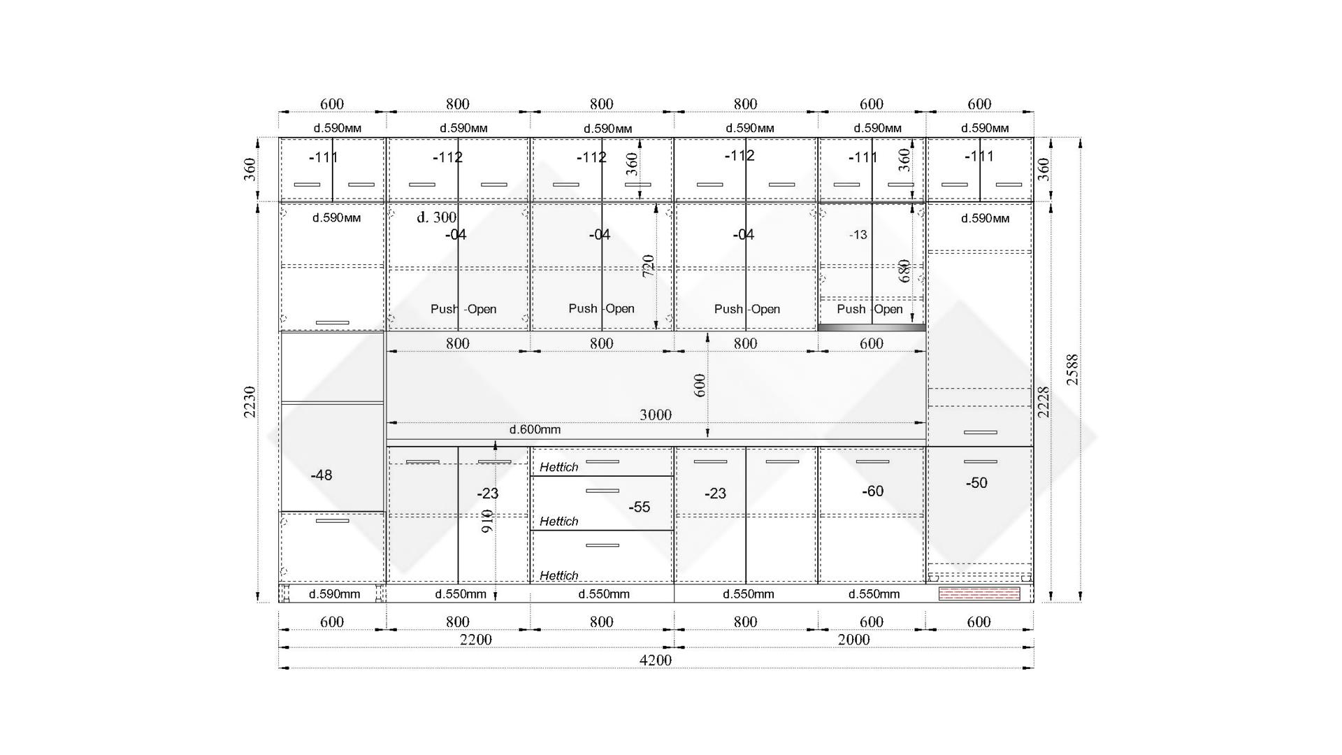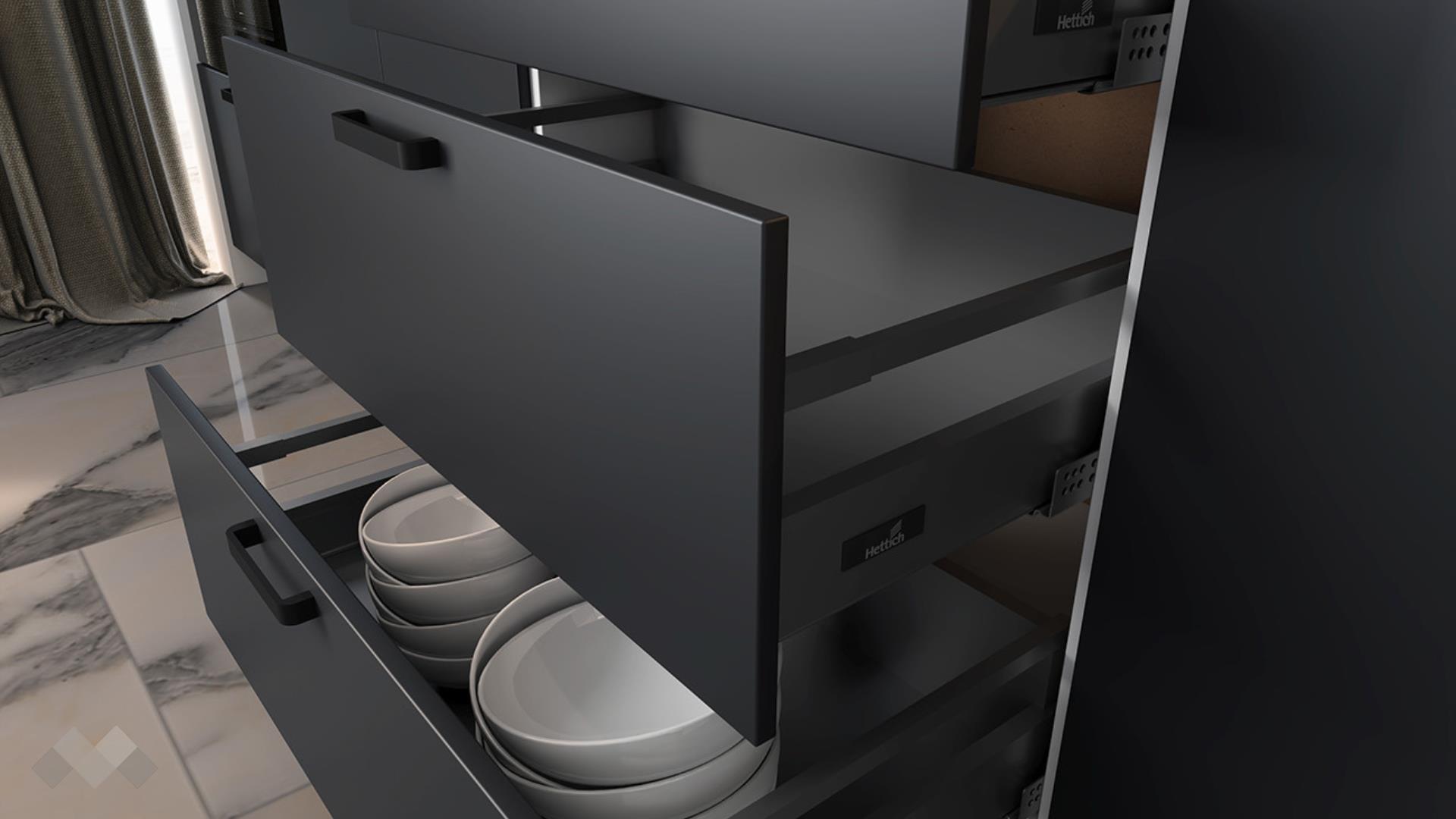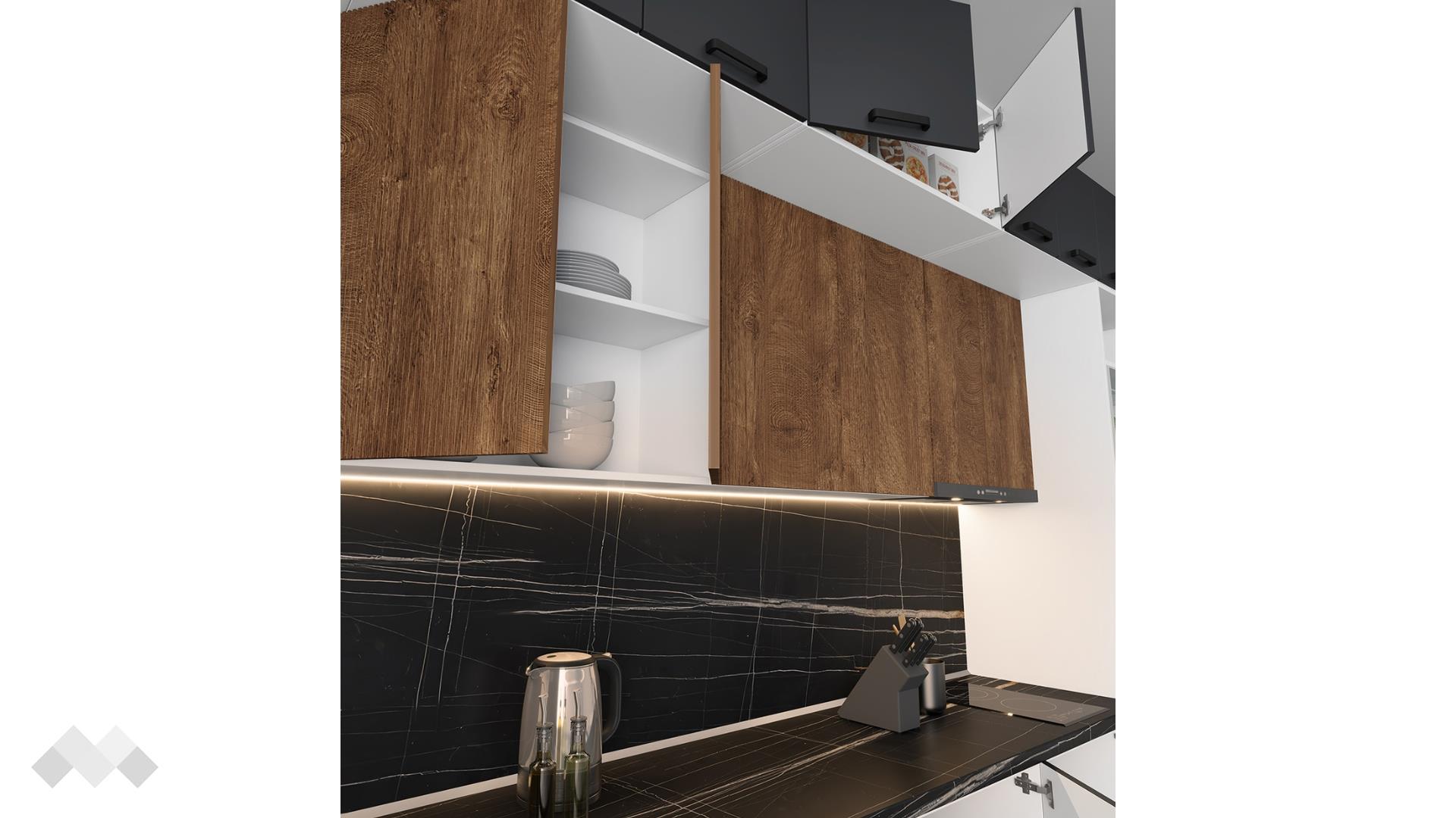 Горния ред шкафове са удобни и функционални - побират малко изполваните уреди и съдове. Основния ред горни шкафове са просторни за най-често използваните уреди и посуда. Шкаф стандартен размер за вграждане на хладилник - за да бъде всичко в синхрон. Шкаф за вграждане на фурна и микровълнова. Долния ред шкафове е функционално подбран - перфектната комбинация на рафтове и чекмеджета, за да поберат често използваните уреди, подправки и посуда.